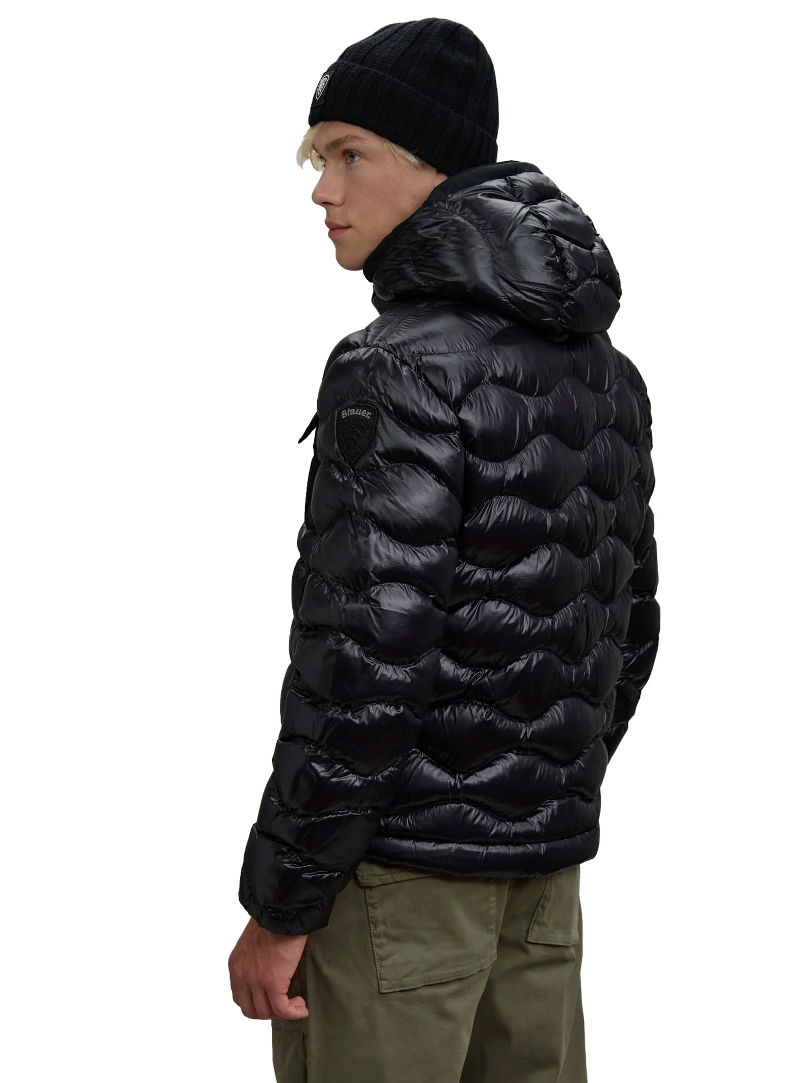 Water-repellent down jacket in micro-rip nylon with a subtle check pattern.