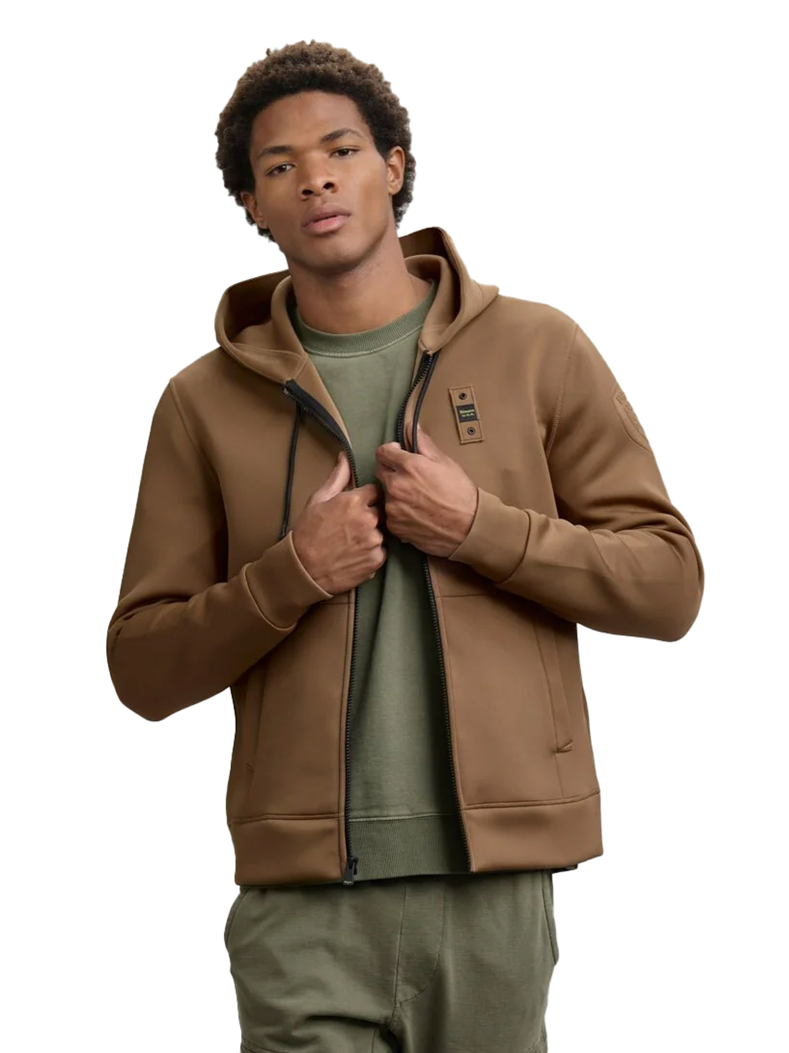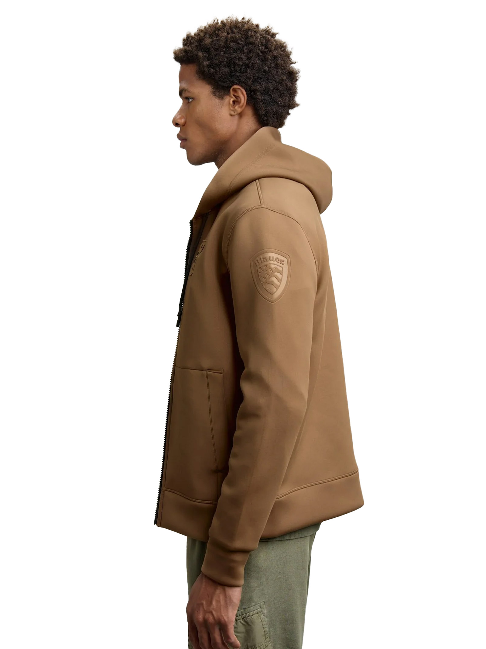 Hooded sweatshirt with front opening in slightly stretchy scuba fabric. Fabric is resistant to crushing and creasing.