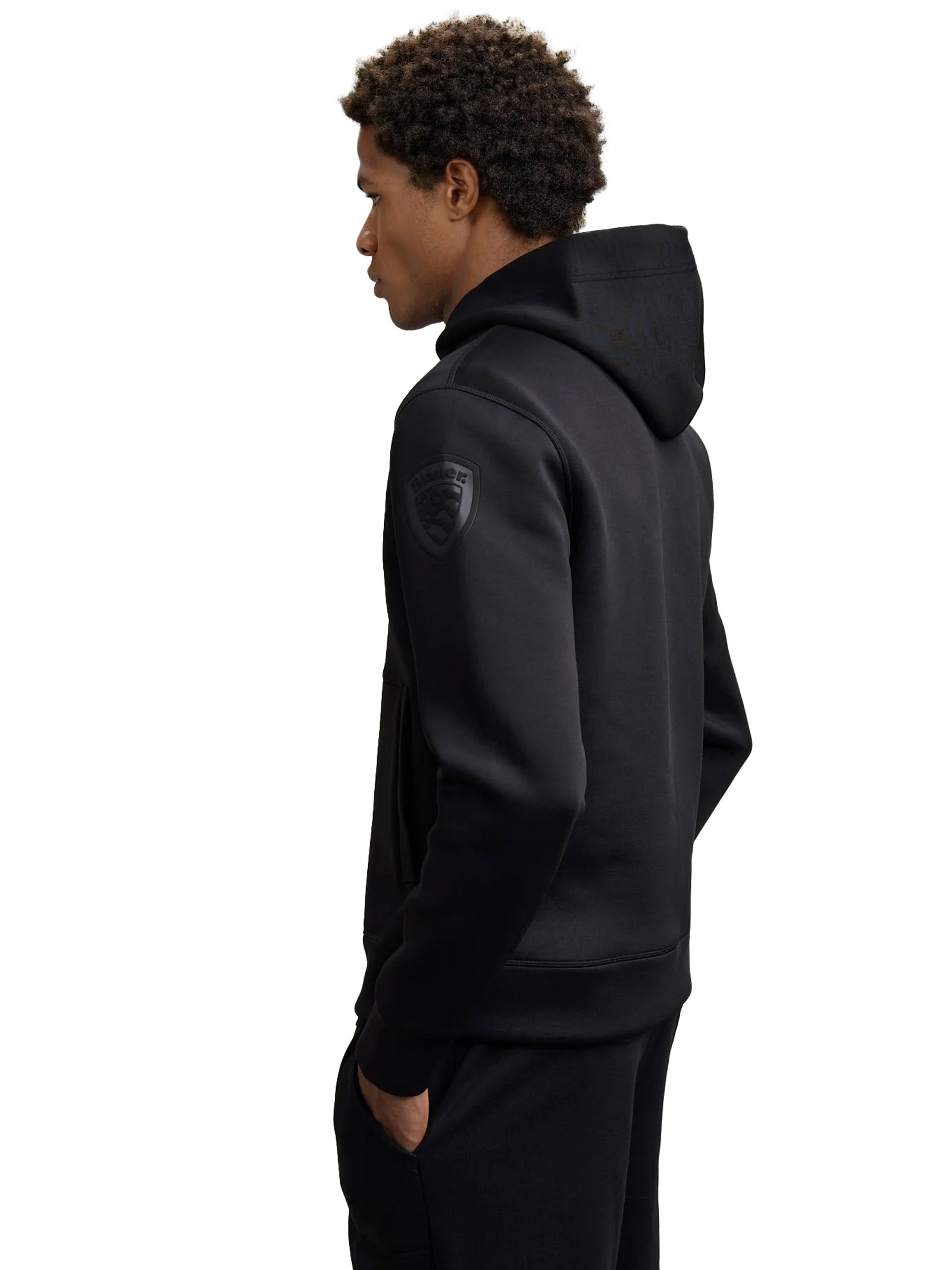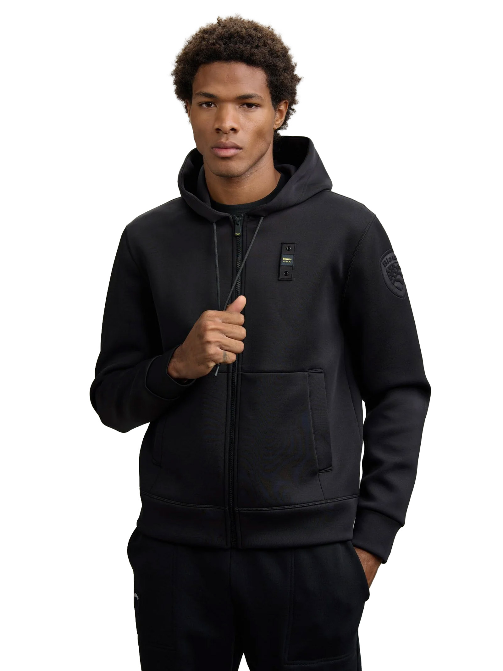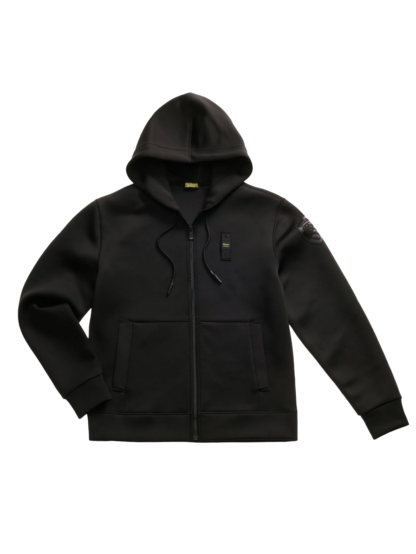Hooded sweatshirt with front opening in slightly stretchy scuba fabric. Fabric is resistant to crushing and creasing.