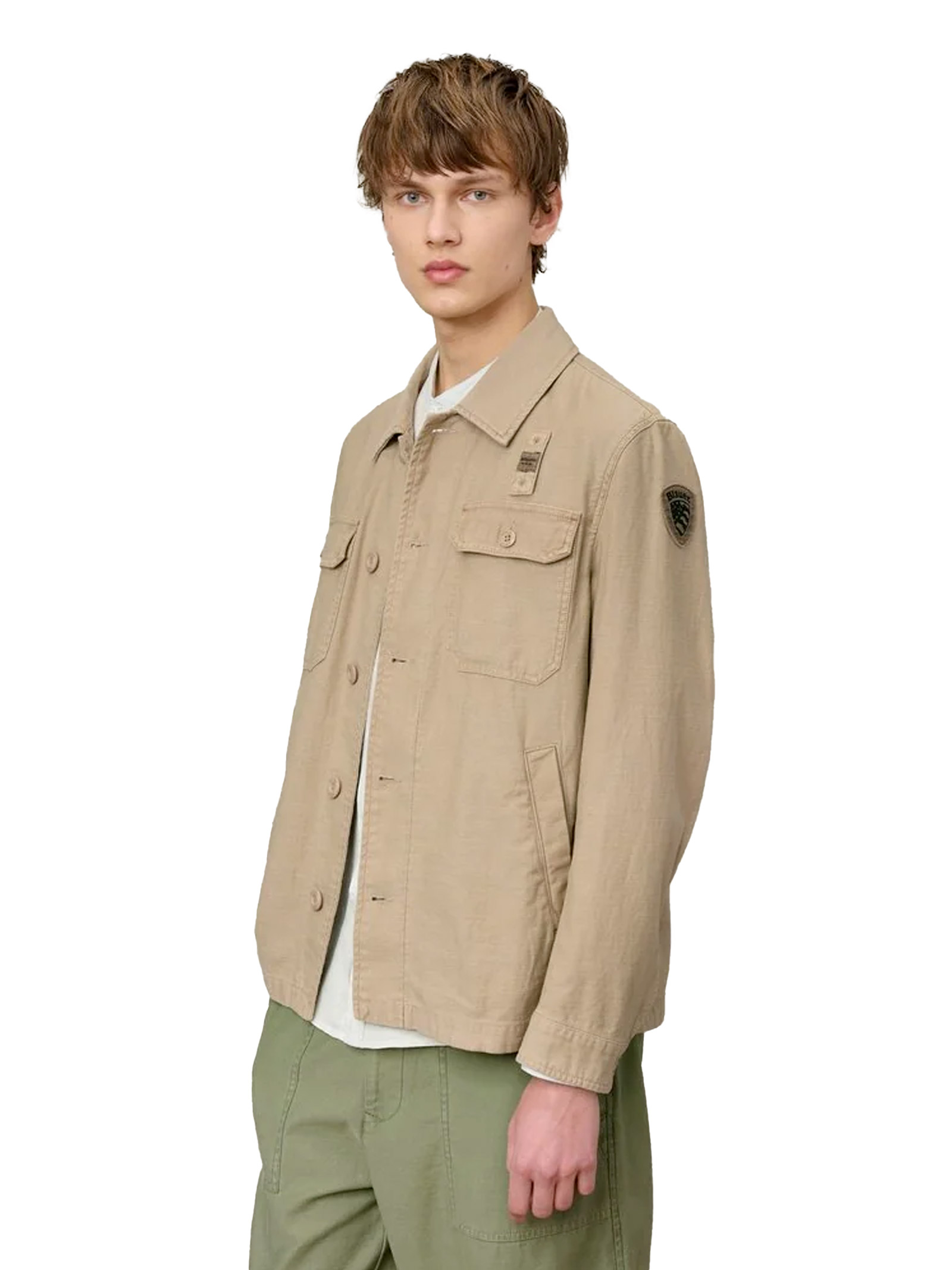 Unlined garment-dyed jacket with a shirt collar and practical pockets. A casual piece with a unique, original, and worn-in style.