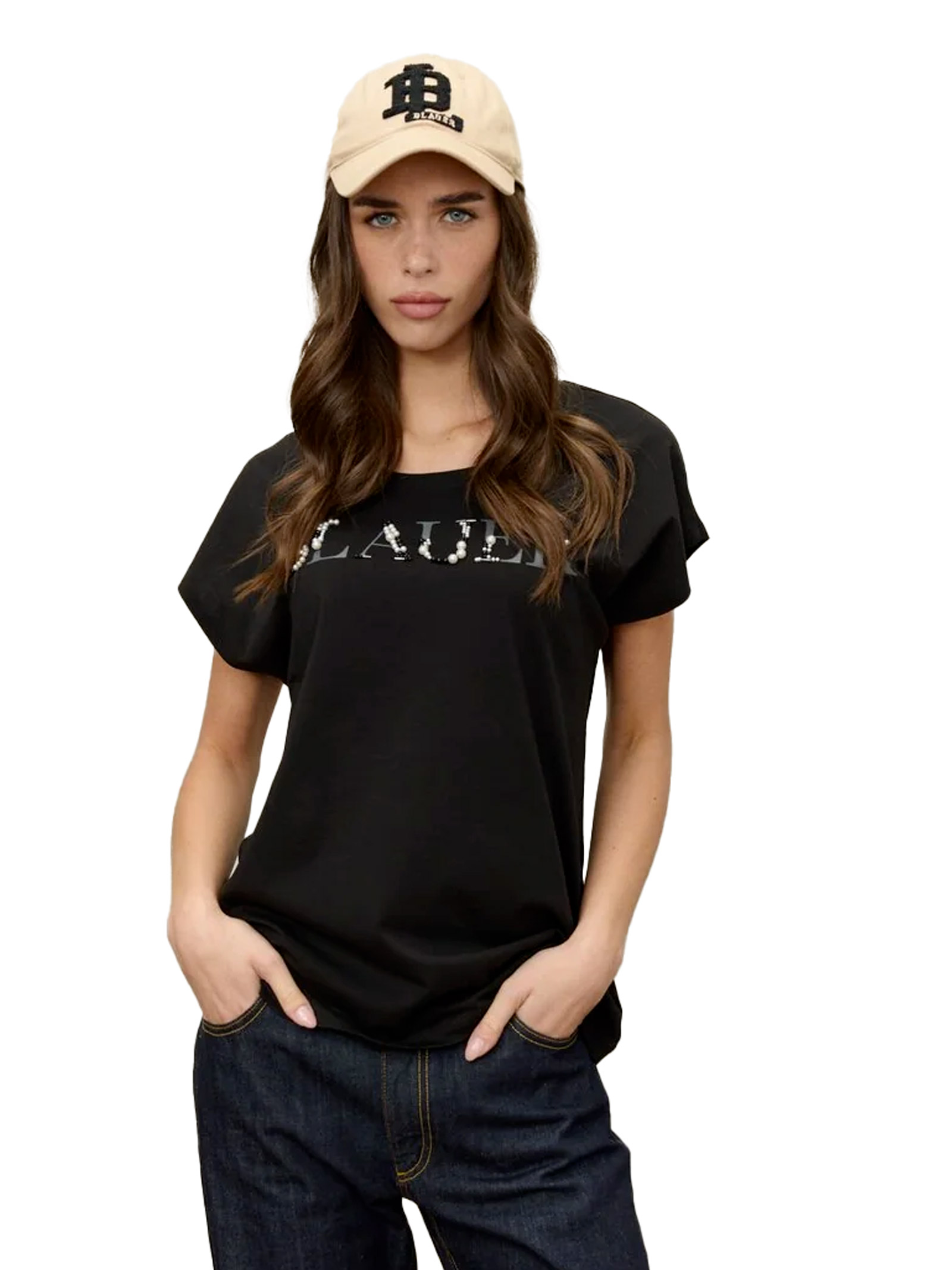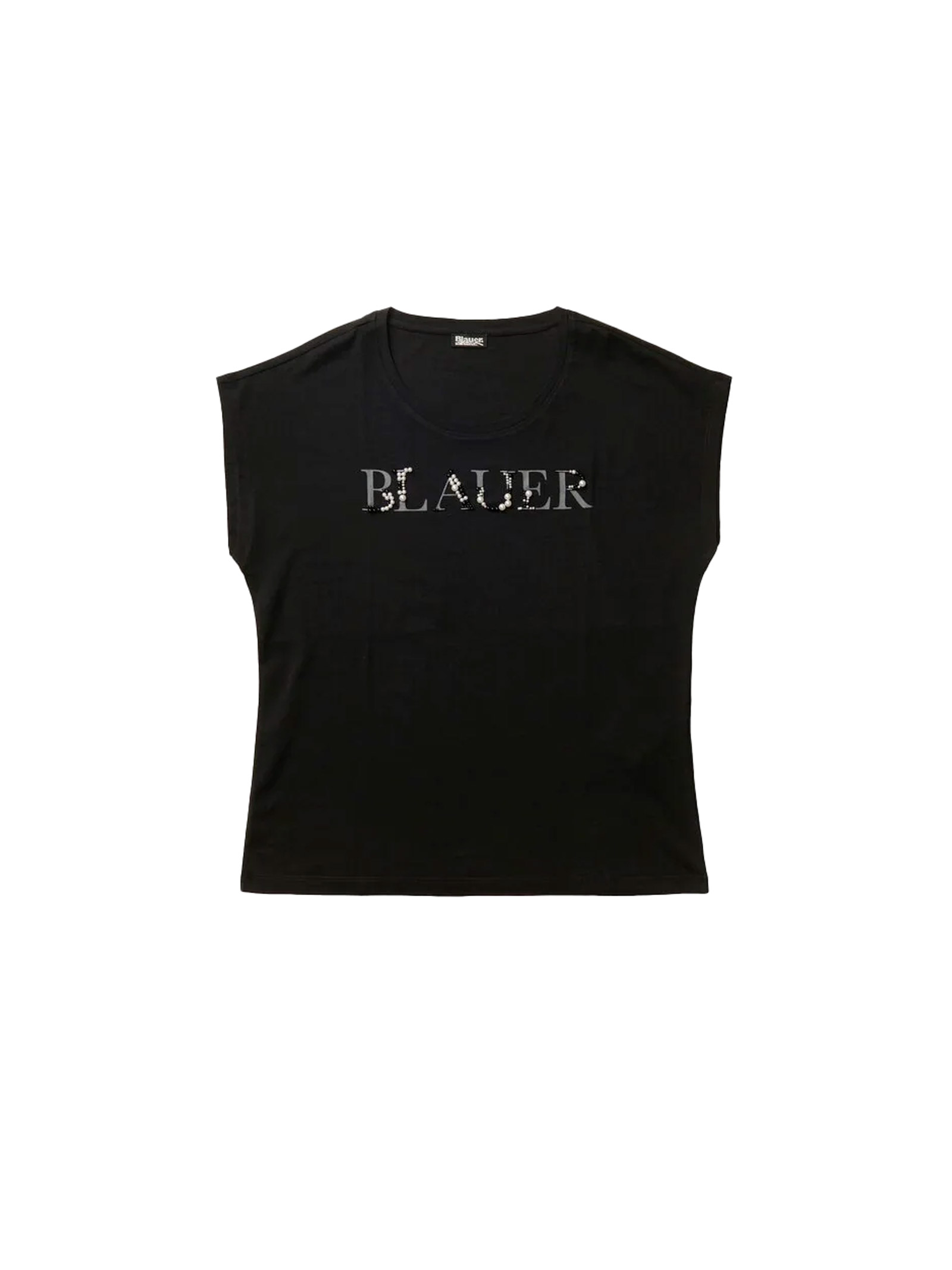 T-shirt with a chest logo decorated with two-tone beads.