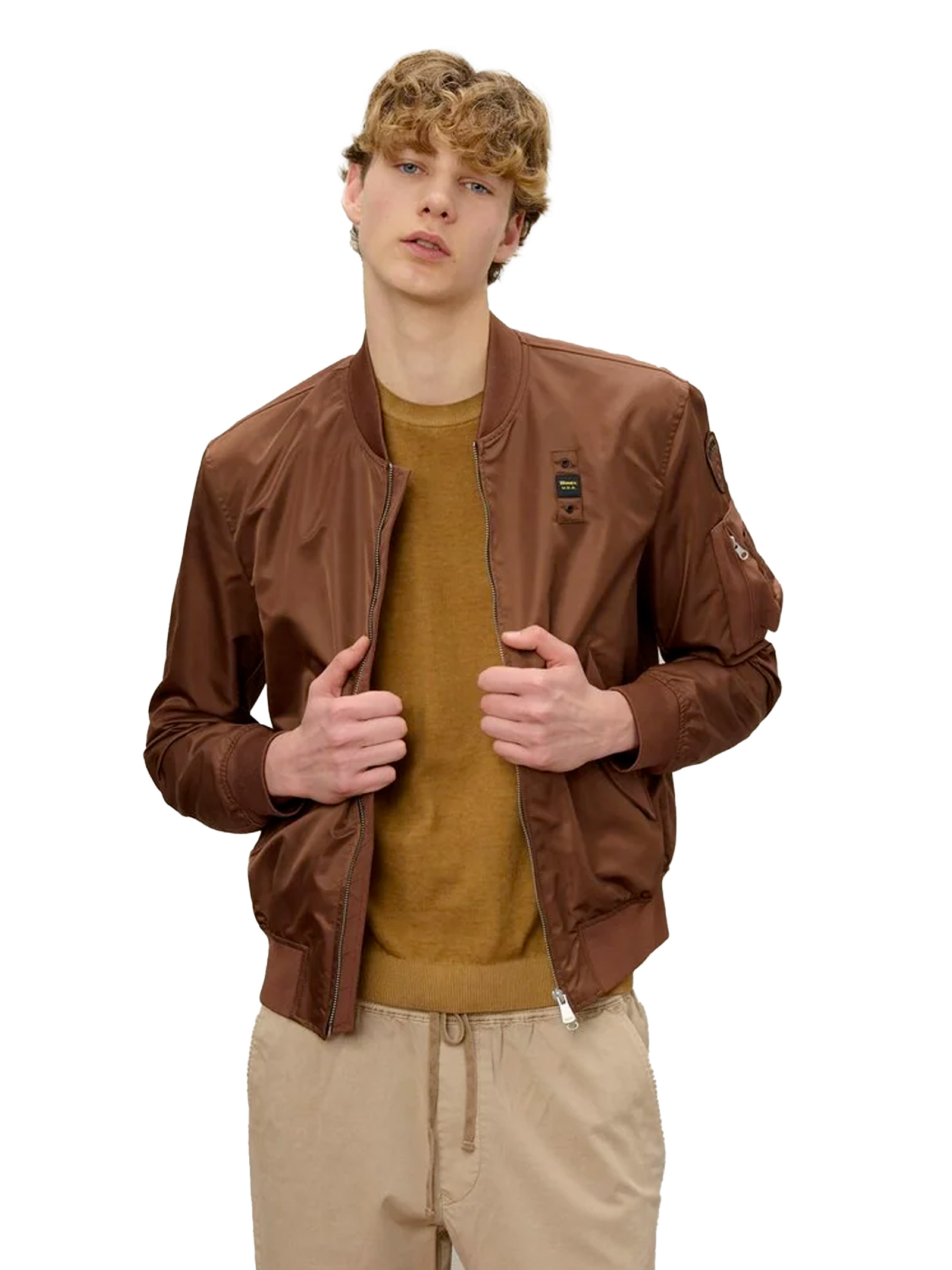 Bomber jacket lined in glossy, smooth nylon on the front and matte neoprene on the back and sleeves. Practical pleated pocket on the left sleeve with pen holder. A military-inspired piece with fashion influences.