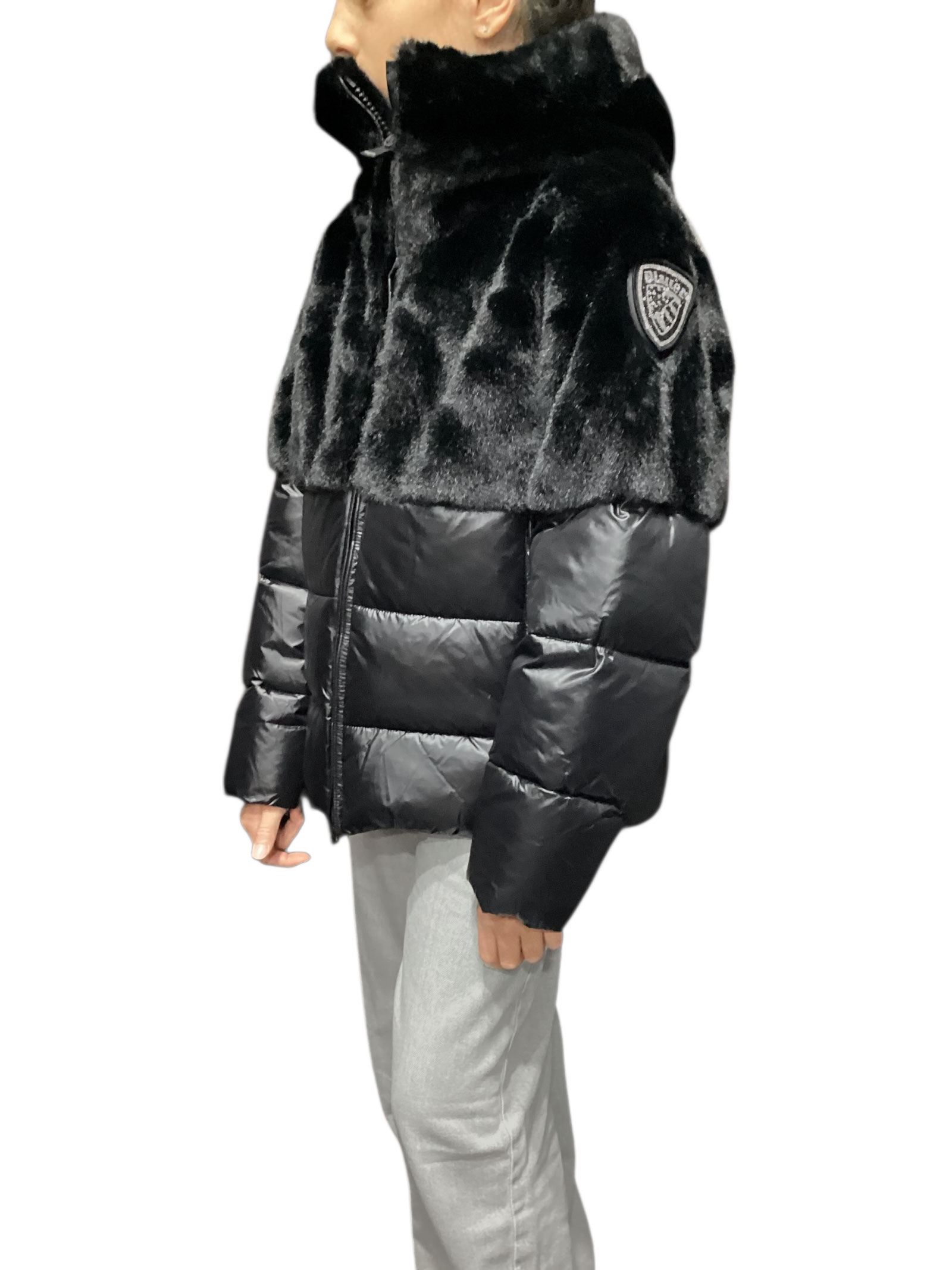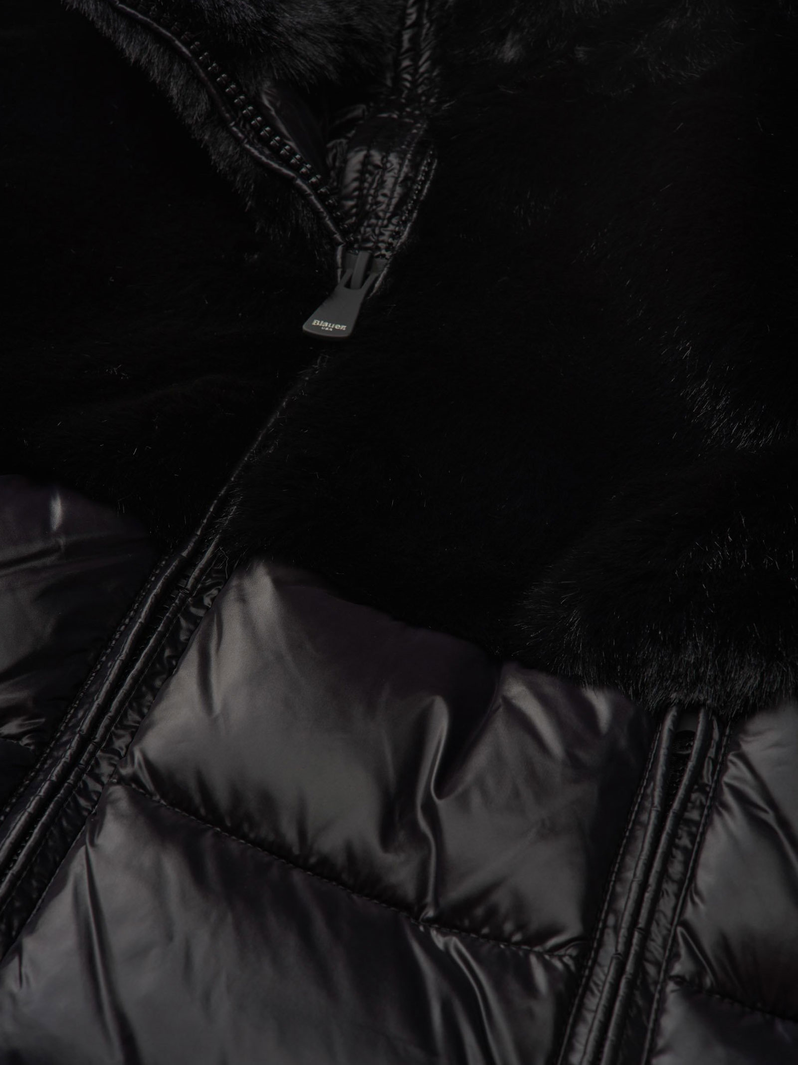 Jacket with eco-fur on the upper part and shiny nylon on the lower part. Warm hood to protect against harsh winters without sacrificing style.