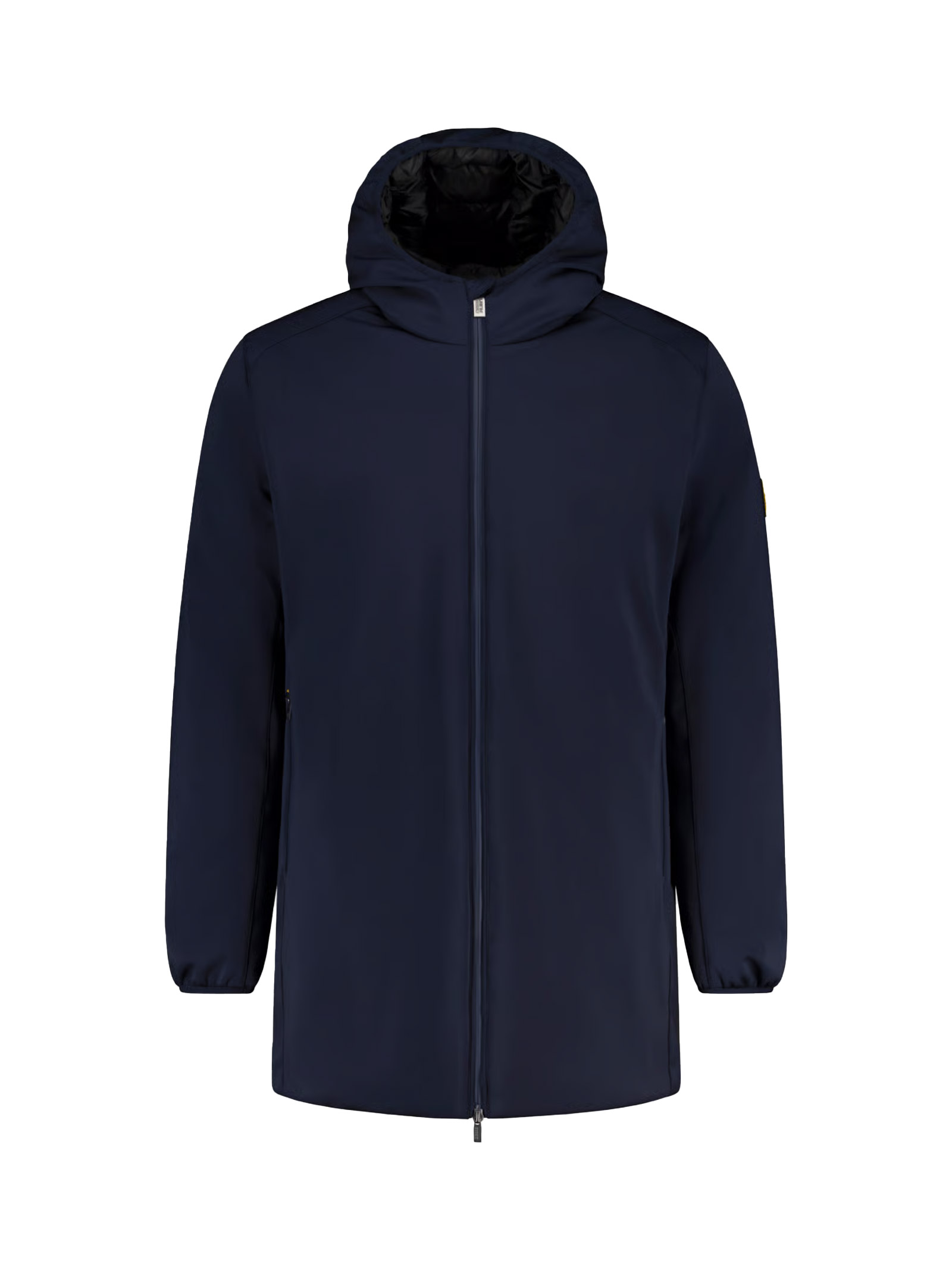 Long men's softshell jacket with hood and FELLEX® Thermar Pearl eco-down padding.