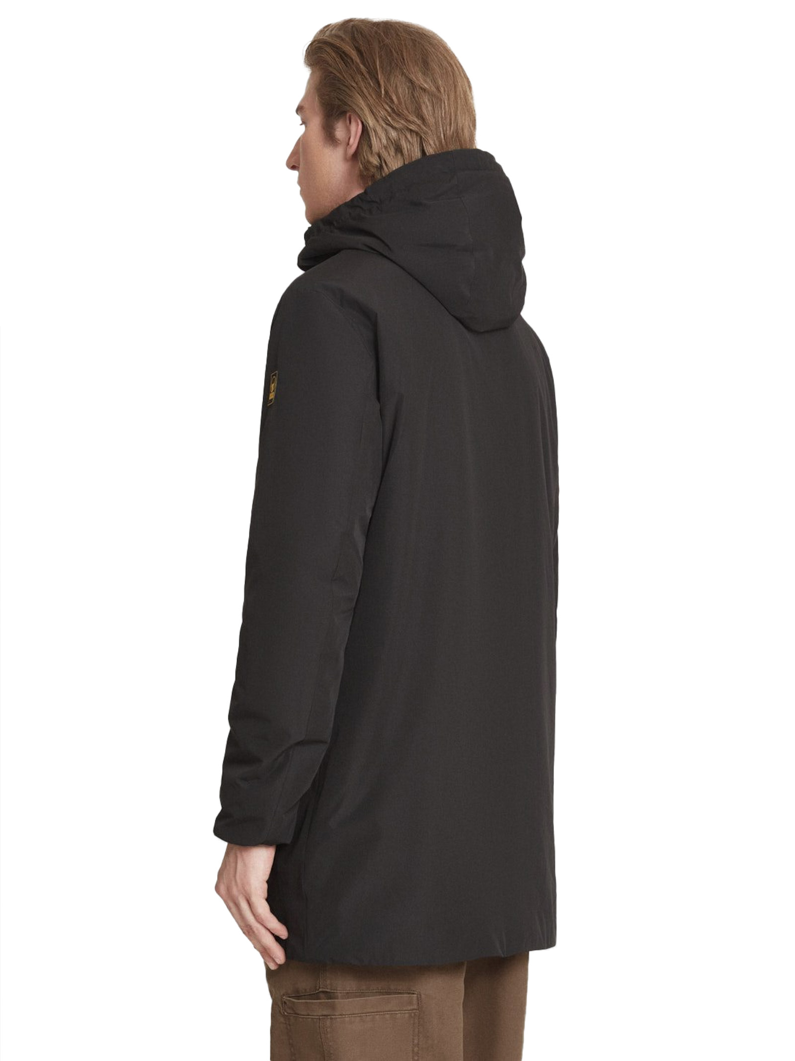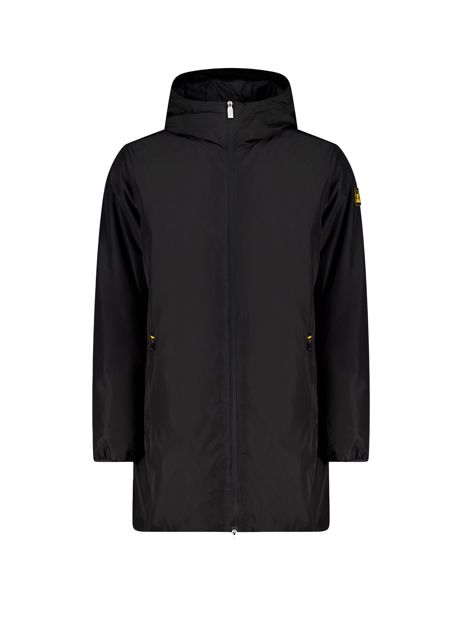Long black jacket with hood, perfect from the city to the outdoors, and from autumn to spring.