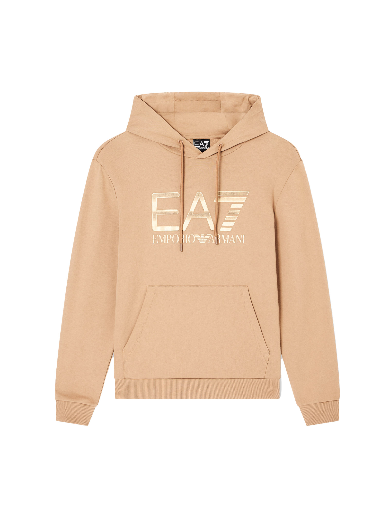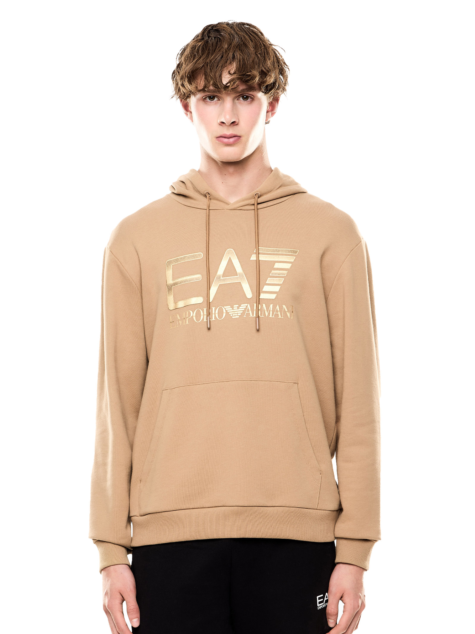 Hoodie made of stretch cotton with a regular fit. The model is customized with a maxi EA7 logo on the chest with a neon-effect finish, echoing other creations from the Logo Series line.