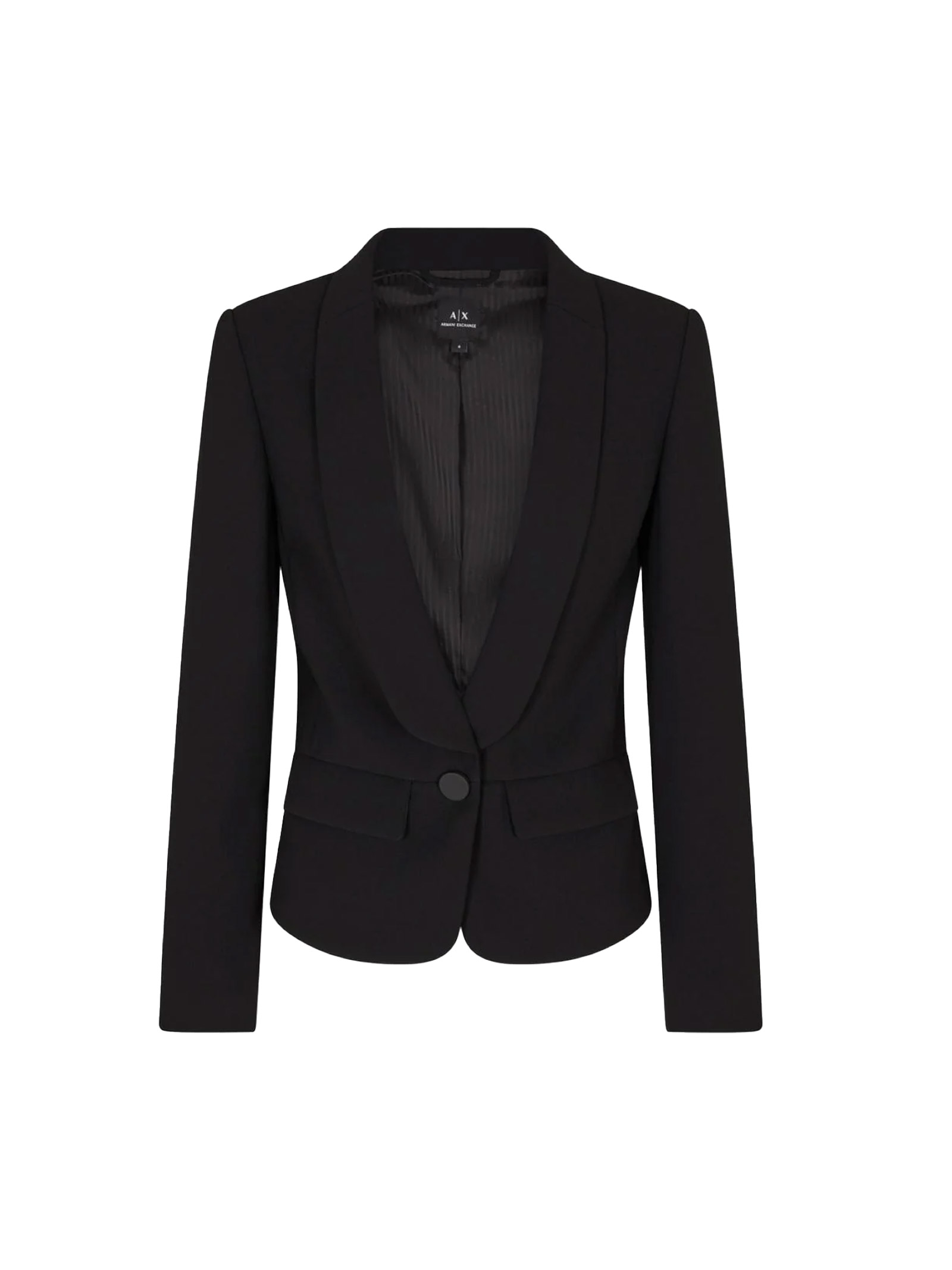This black womens blazer from Armani Exchange is an elegant and versatile piece, perfect for completing refined and contemporary looks. Its modern and clean design makes it ideal for those who love a sophisticated yet current style, suitable for both formal occasions and chic casual outfits. A wardrobe must-have, synonymous with class and personality.