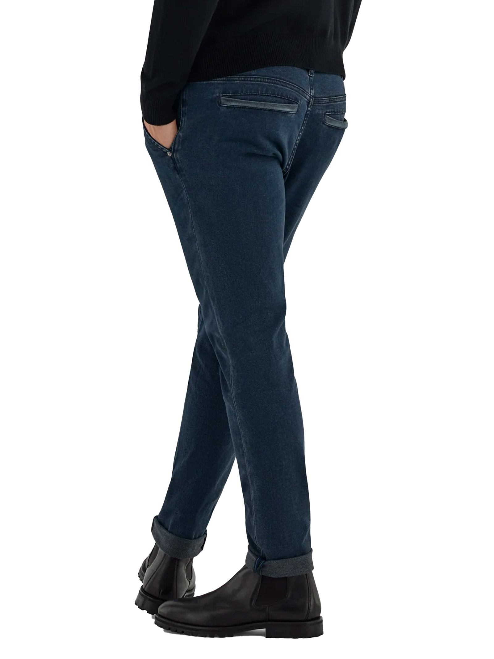 Clean lines and an urban spirit define these skinny-fit chino jeans made from 10 OZ blue-black diagonal stretch fabric. The medium pumice wash preserves the fabrics deep intensity while highlighting its texture and minimal details. An essential piece that balances comfort and contemporary metropolitan style.