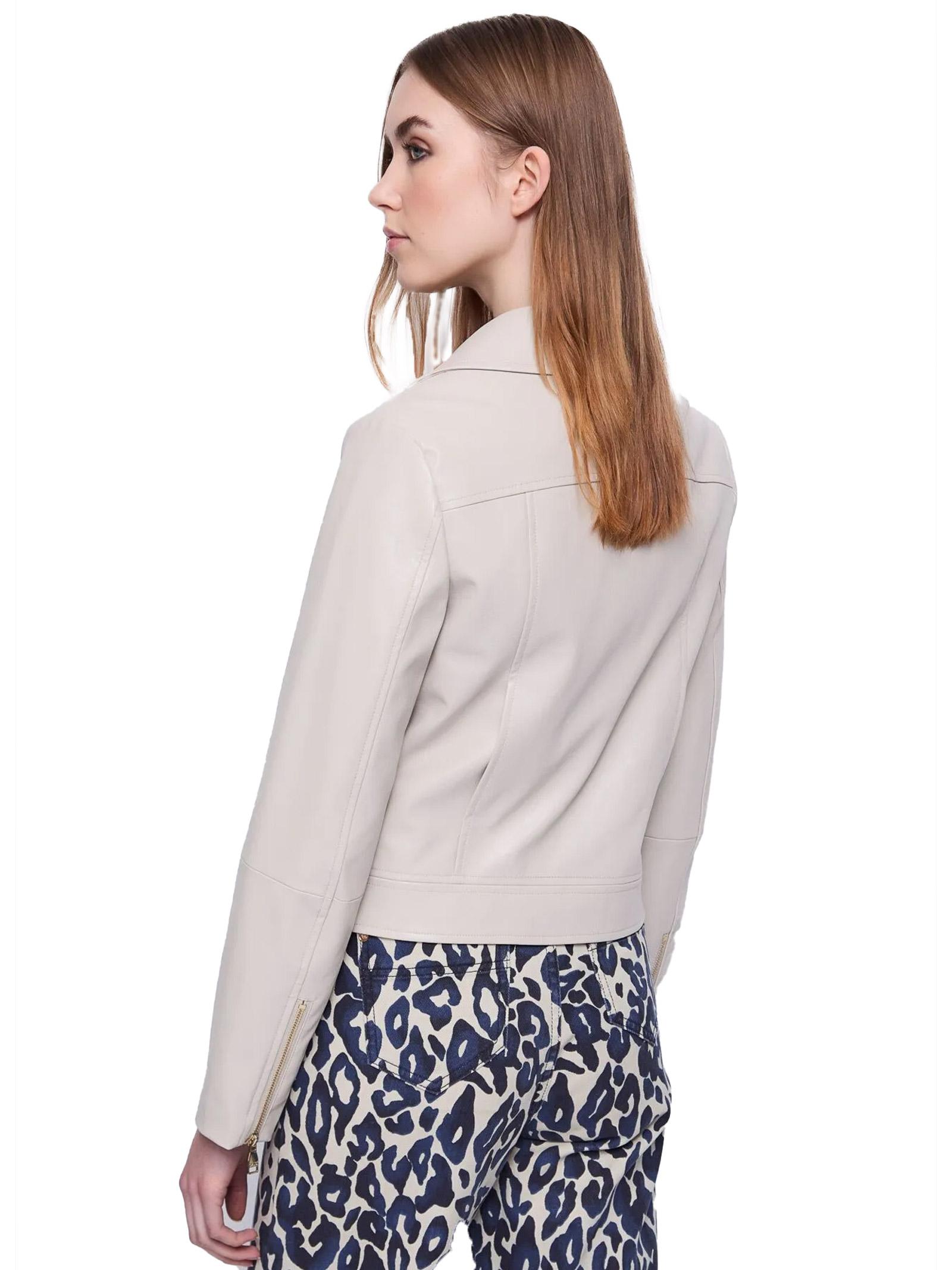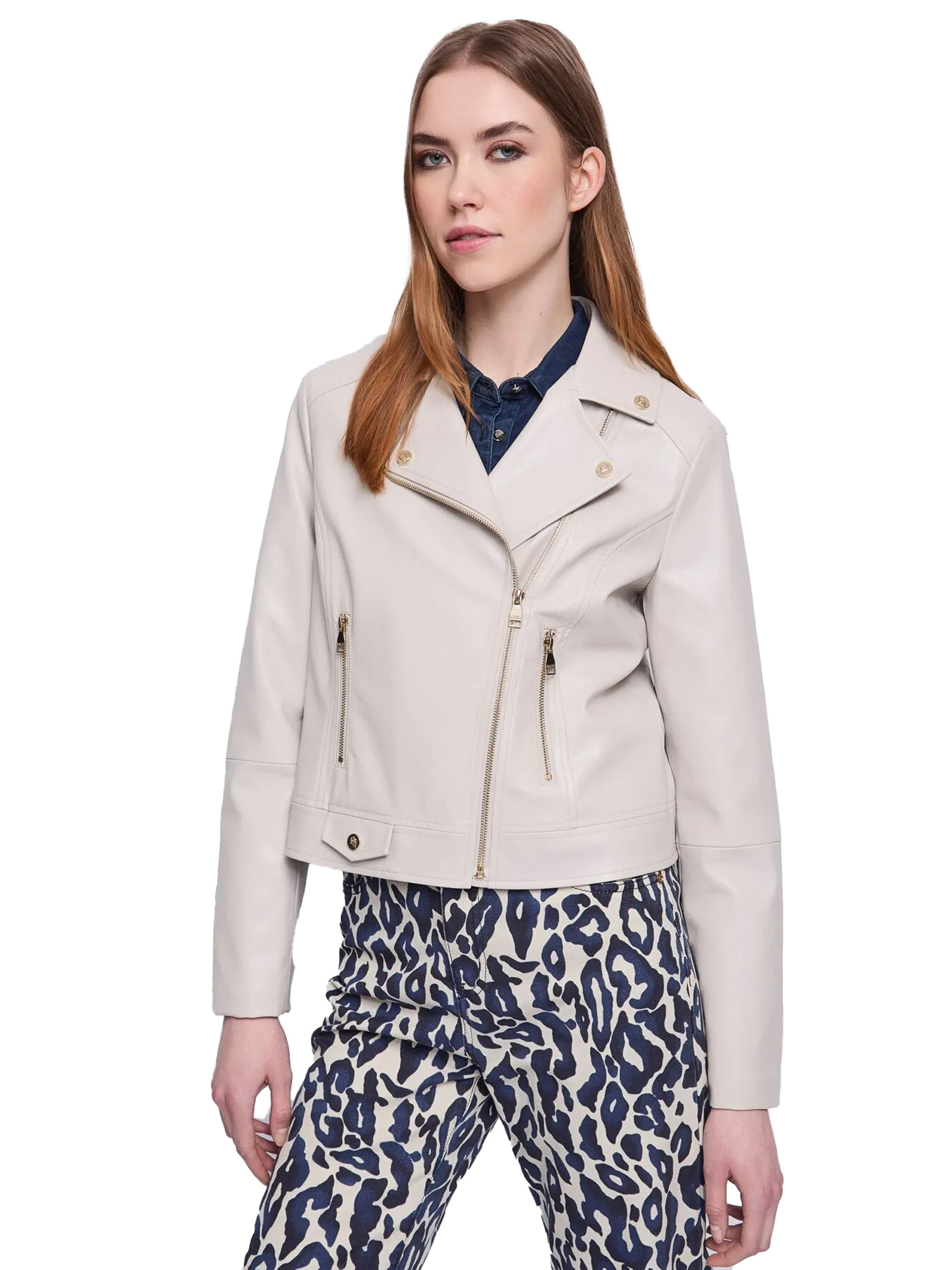 Choose the faux-leather biker jacket with notched lapel collar and zip pockets. For a bold, urban look.