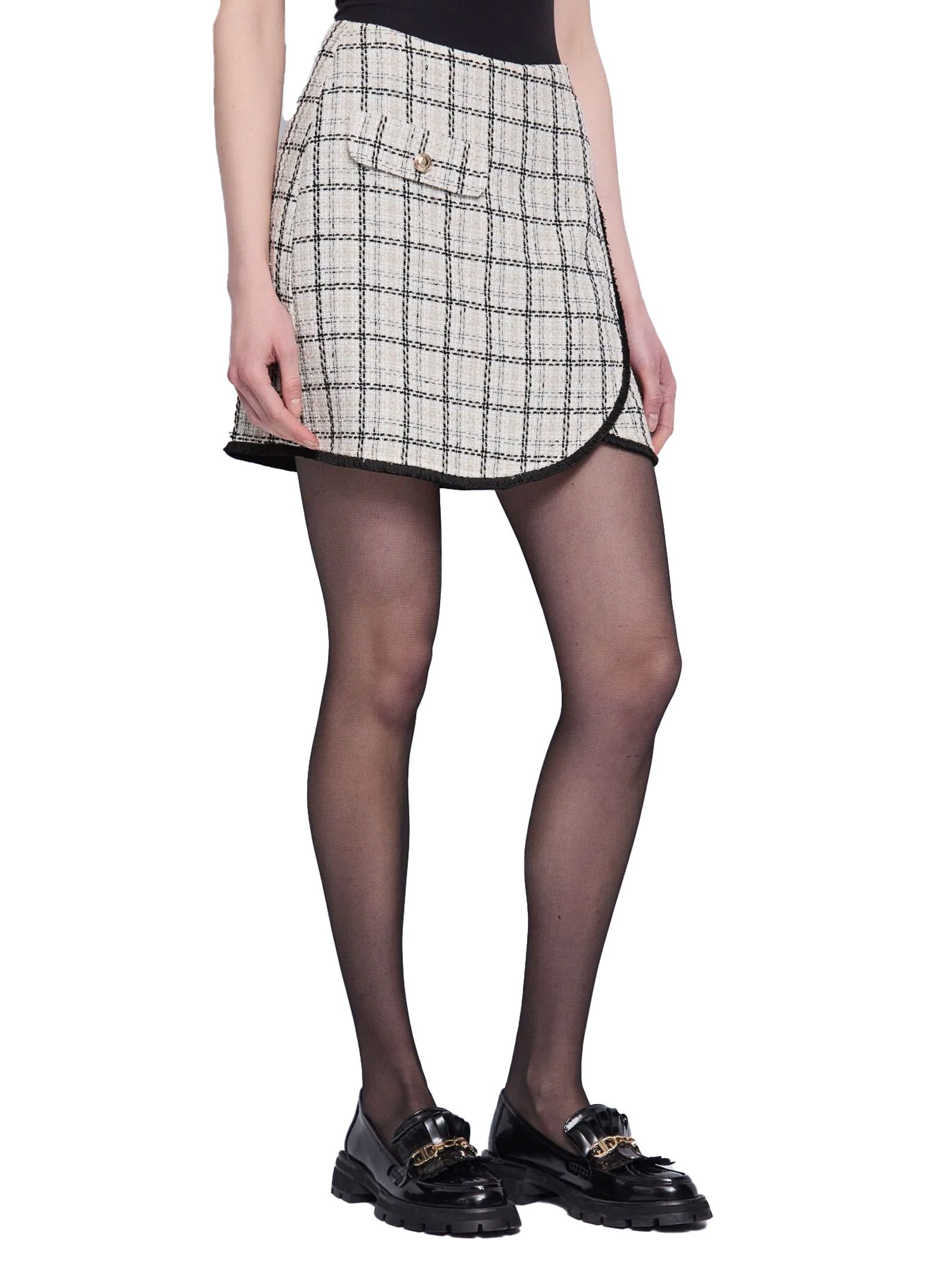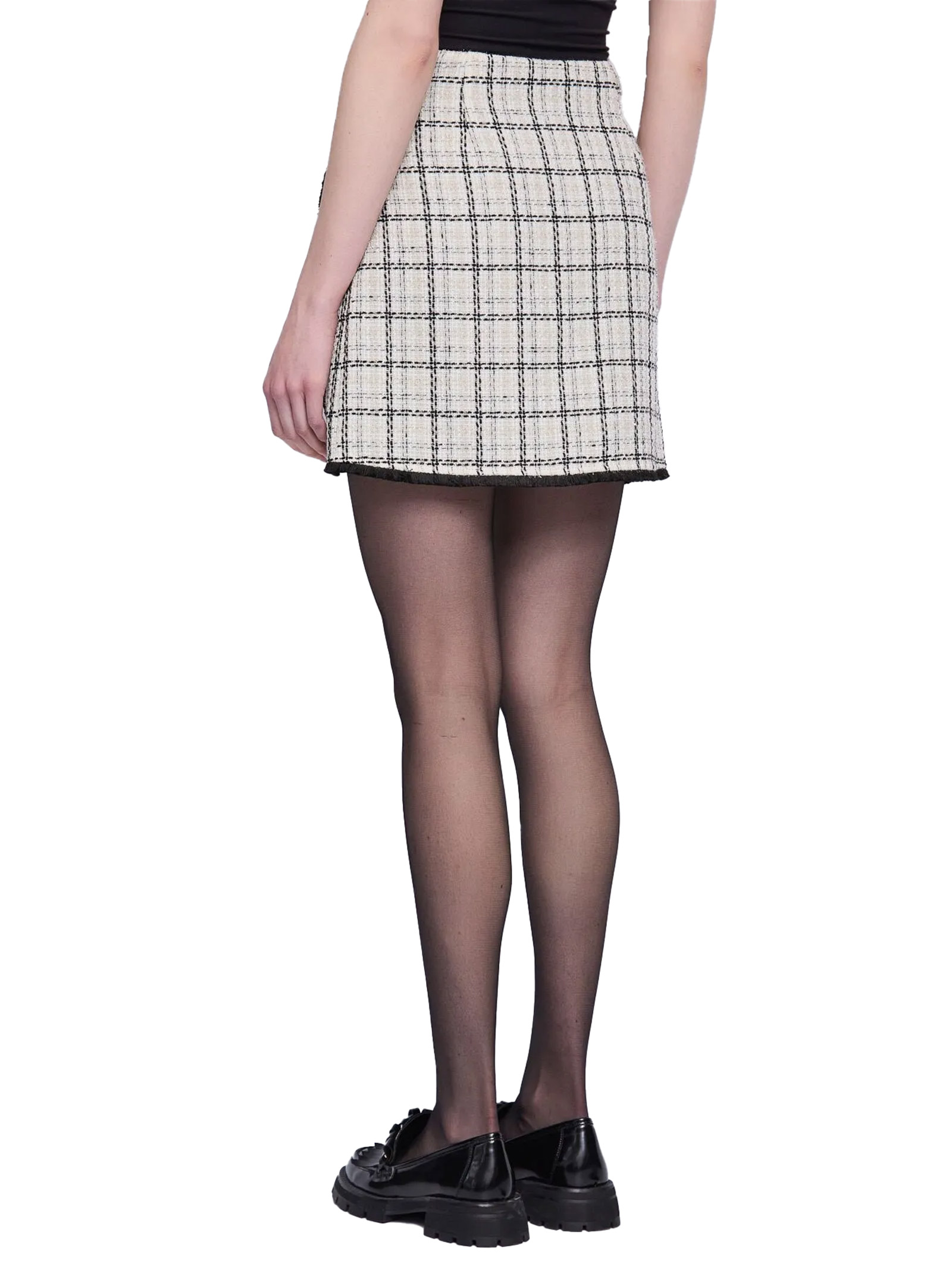 Choose the wool-blend tweed mini skirt with check pattern and frayed edges. A sophisticated piece with irresistible retro charm.