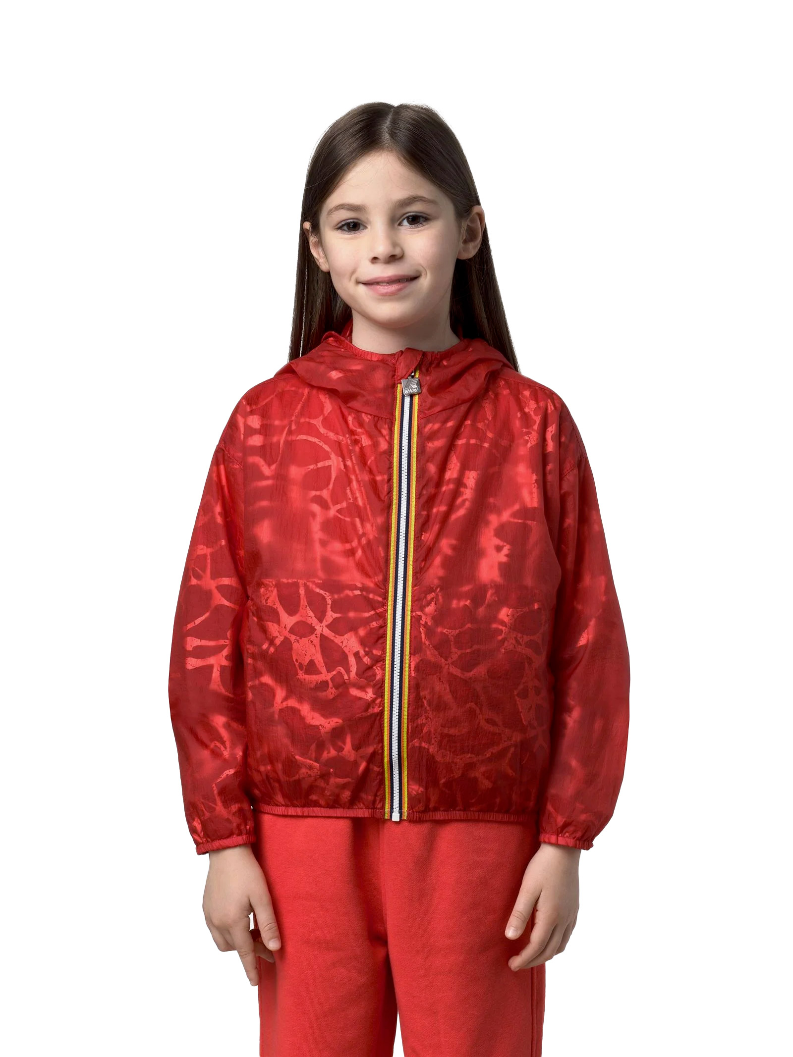 Laurette is a short girls jacket ideal for milder seasons. The reversible design plays with contrasts between textures and transparency: one side is made of ultra-light semi-sheer fabric, while the other is in nylon with a metallic laminated graphic inspired by sunlight reflections on rippled water. When worn on the super-light side, the underlying print shows through, creating a shifting visual effect.
