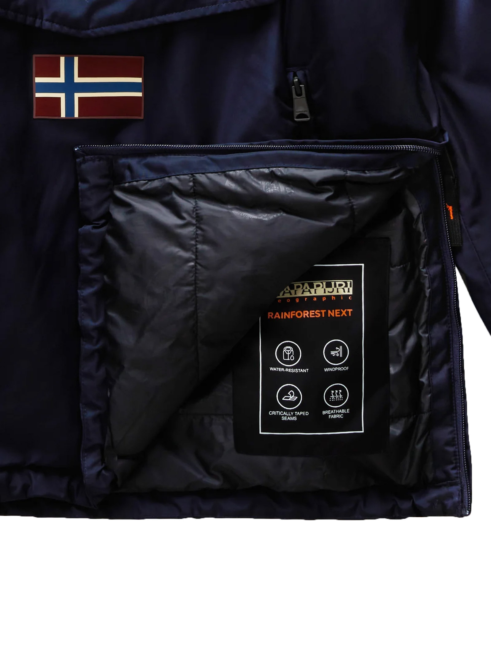 An embodiment of Napapijri heritage, the Rainforest has been keeping people warm in style since 1995. Our beloved anorak returns with a new rubber logo, double zip closure, ventilation eyelets, and adjustable hem and hood. Designed for the outdoors with breathable, water-resistant fabric, it features recycled down-free insulation that provides warmth when temperatures drop.