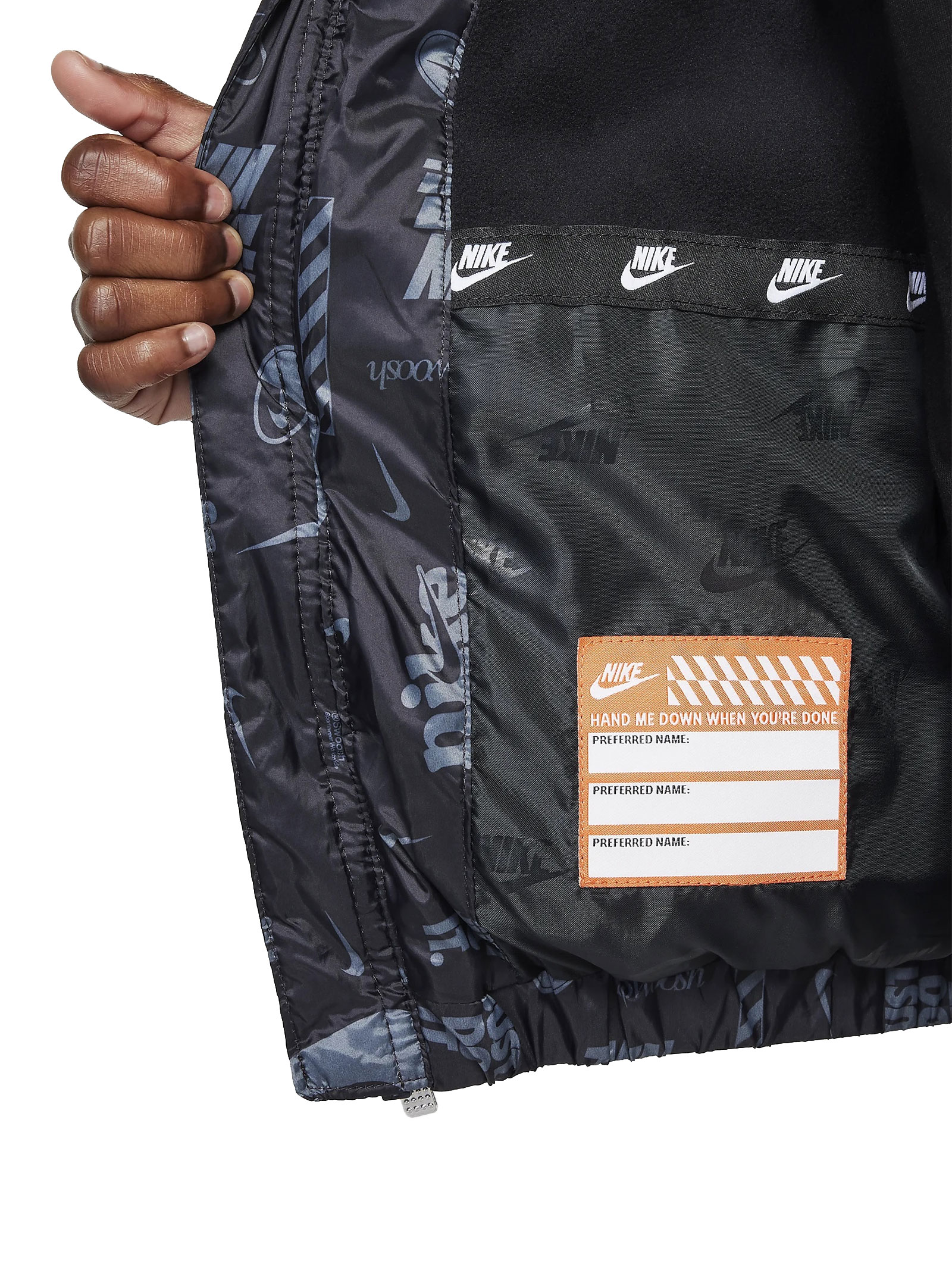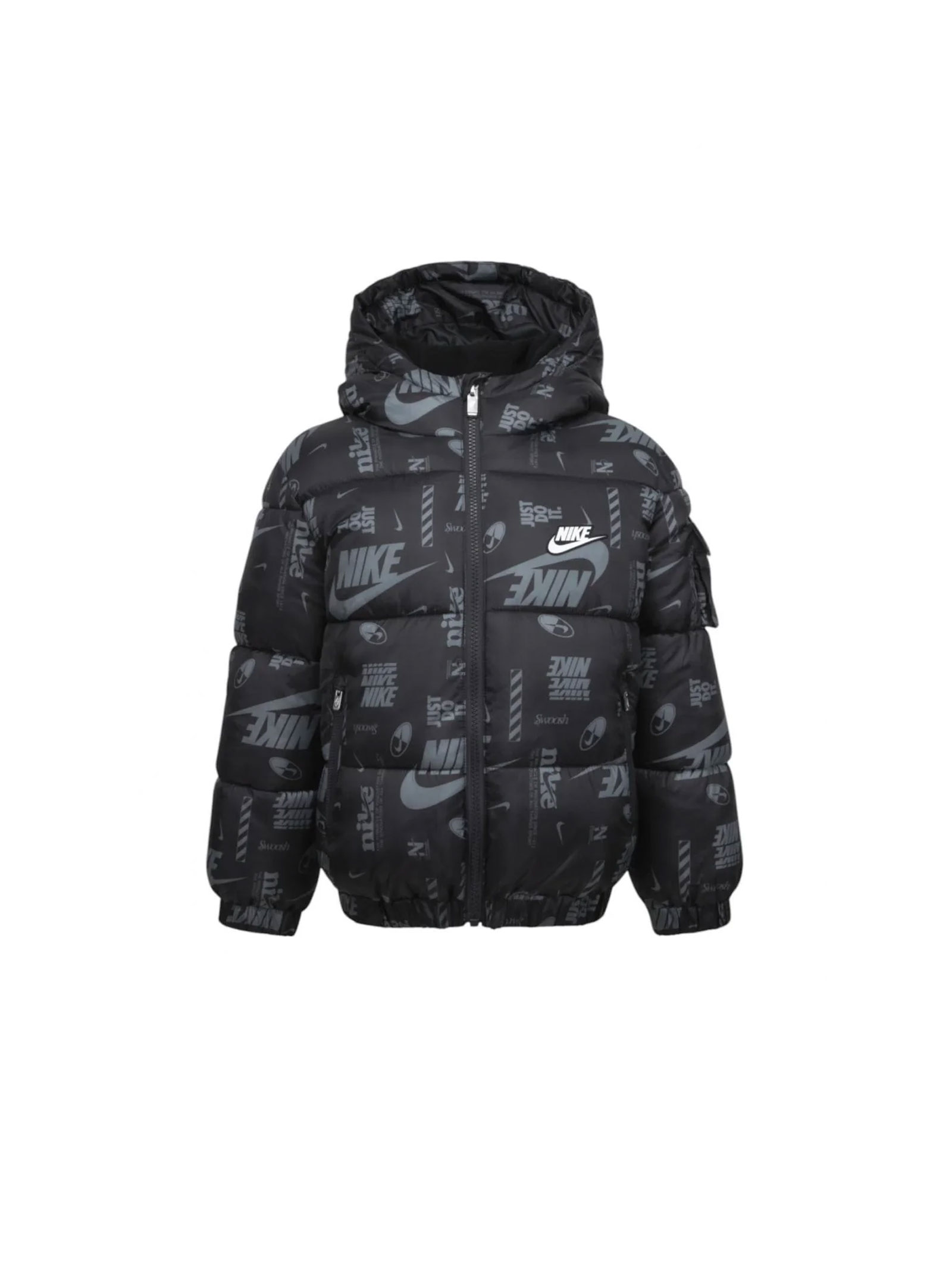 This statement down jacket is made of woven polyester and features an all-over quilted pattern with soft synthetic down filling for cozy warmth. The relaxed fit and full zip closure make it easy to layer, while the zip side pockets and a flap pocket with snap button provide secure storage for small items. This jacket includes a hood and a water-repellent finish to help keep children dry in the rain.