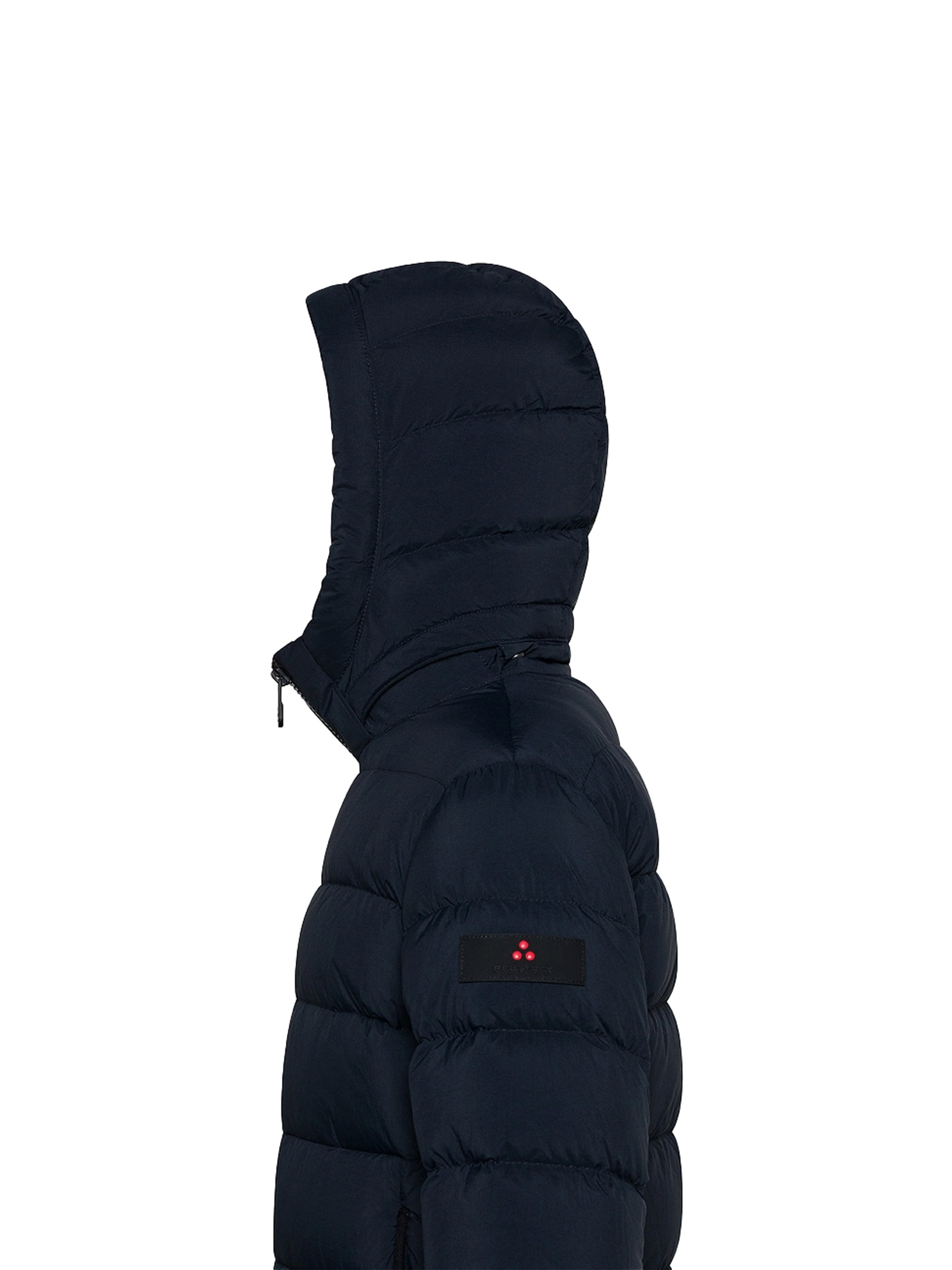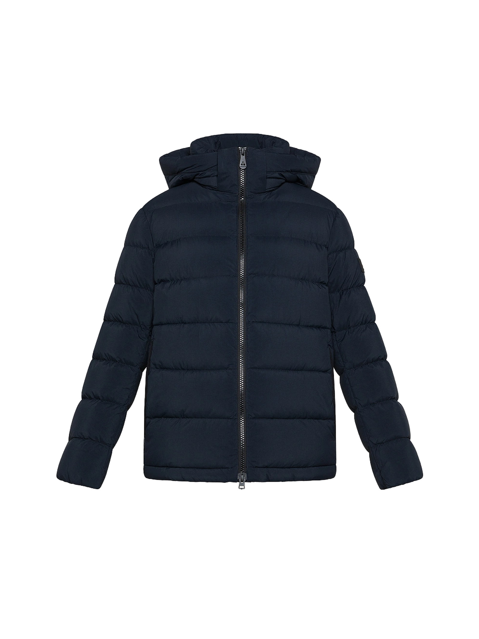 Comfortable and lightweight quilted down jacket, ideal to accompany little ones on every daily adventure. Made from 20-denier recycled nylon fabric, weighing only 50 g, with a semi-matte finish and downproof construction that prevents feather leakage. Filled with certified natural down, it offers enveloping warmth without feeling heavy. The fixed hood and welt side pockets complete the essential and practical design. The outer fabric is water-repellent with a PFC-free treatment, free from harmful chemicals to the environment. A sporty and versatile garment, enhanced by black contrasting details, designed to support the dynamism and curiosity of children and youngsters.