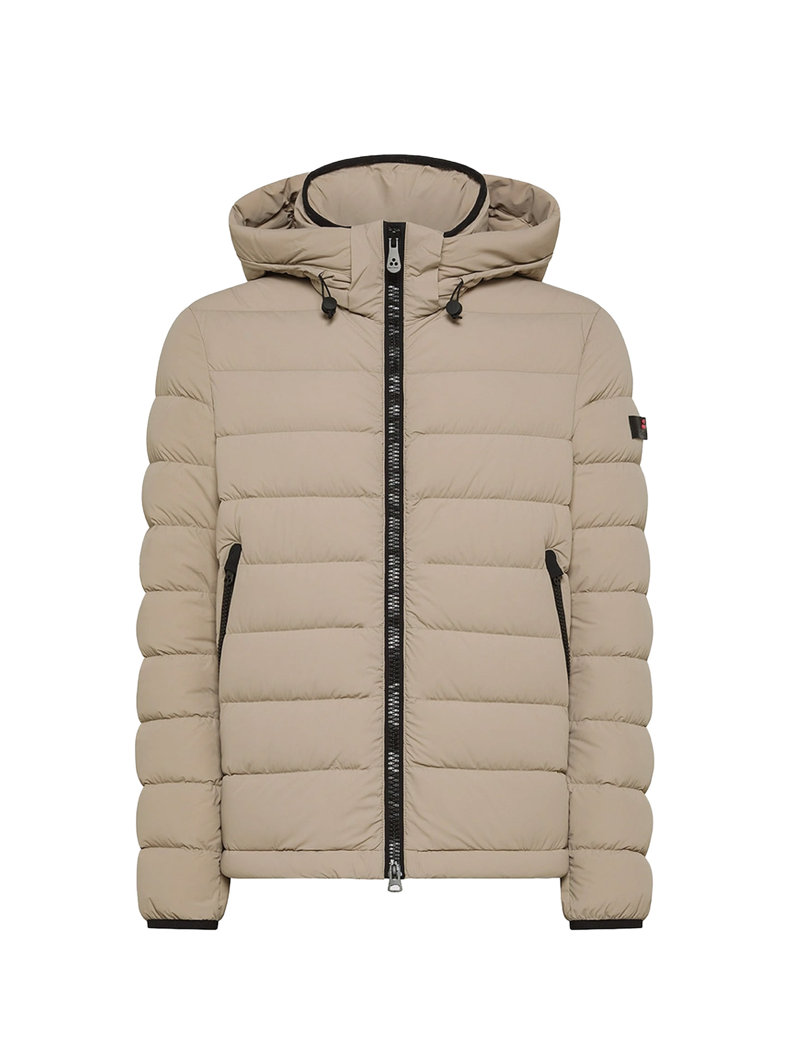 Short down jacket made of stretch fabric crafted from hollow matte elastic nylon fiber, providing comfort, lightness, and volume. The quilting enhances the essential and versatile design line. The certified natural down filling offers enveloping warmth while ensuring breathability and lightness. The fabric is water repellent and down proof, treated with a PFC-free (perfluorinated compounds) water-repellent finish for effective protection without harmful substances. The design is completed by a detachable and adjustable hood, a stand-up collar, and black details double-slider front zipper, large side pockets, and windproof cuffs highlighting an active and contemporary character, perfect for everyday wear.