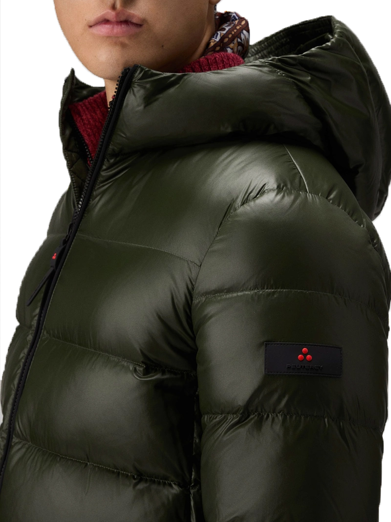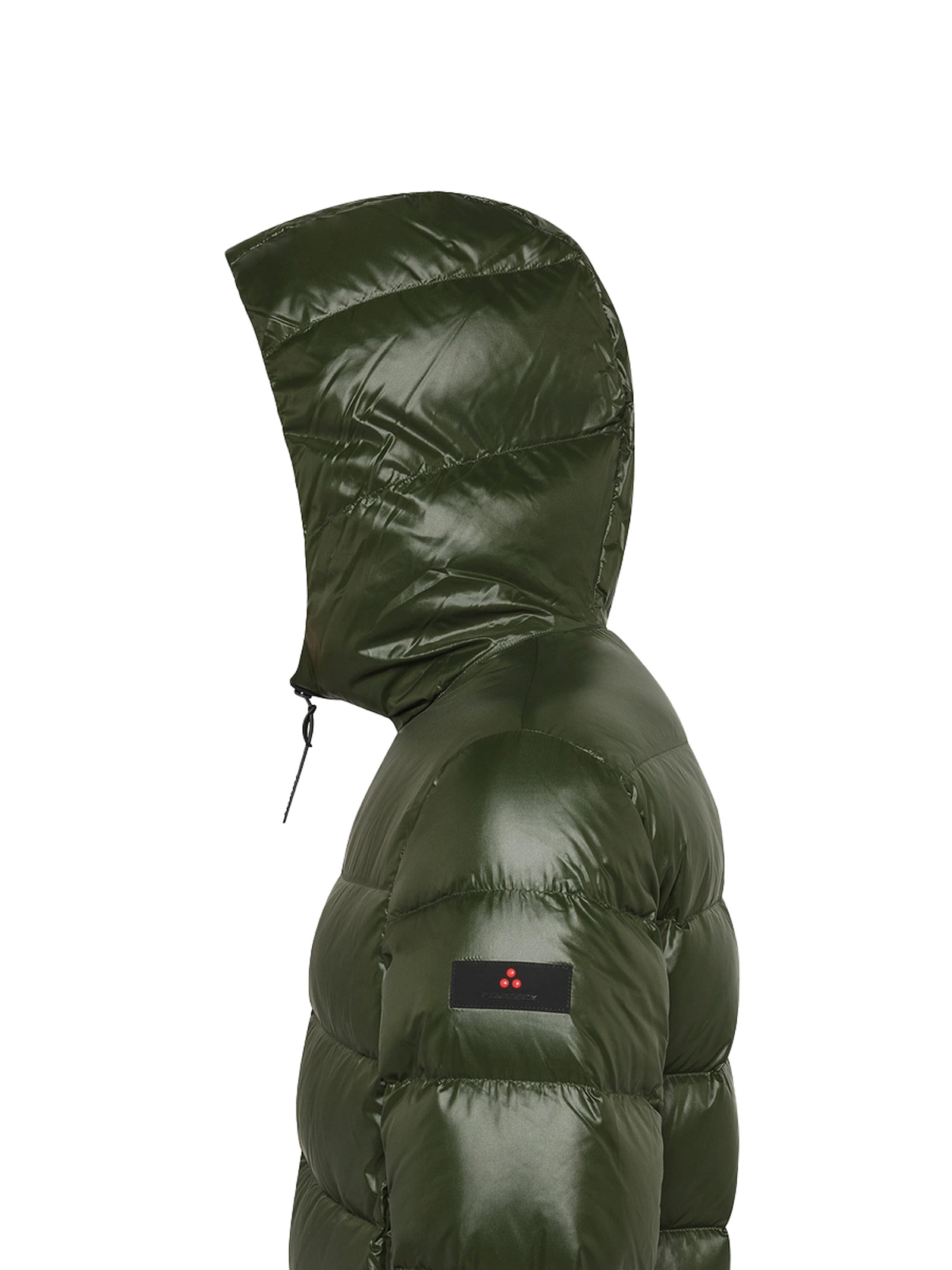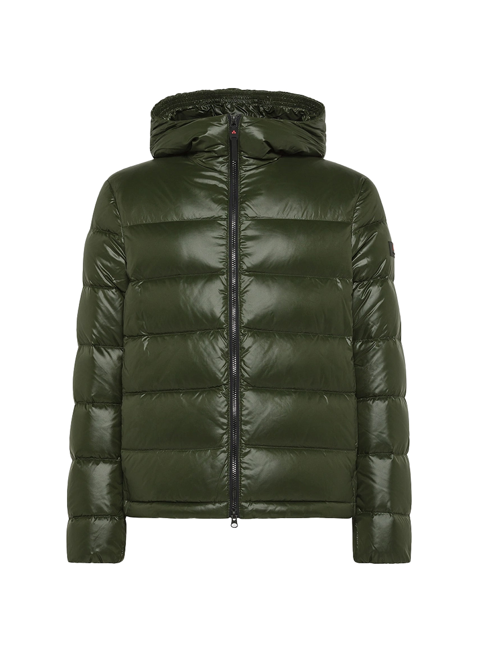 Short down jacket with wide linear channels, made of ultra-light nylon with a distinctive shine and a soft, fluid hand feel. The regular horizontal quilting gives the jacket an essential and graphic look, enhancing its clean lines. The certified natural down filling guarantees ideal thermal comfort during the cold season. The fixed adjustable hood, double-slider central zip, and black details complete a functional and versatile design. Part of the Color line, this wind-resistant and water-repellent down jacket interprets outerwear in a creative and easy way, for an urban look with strong visual impact.