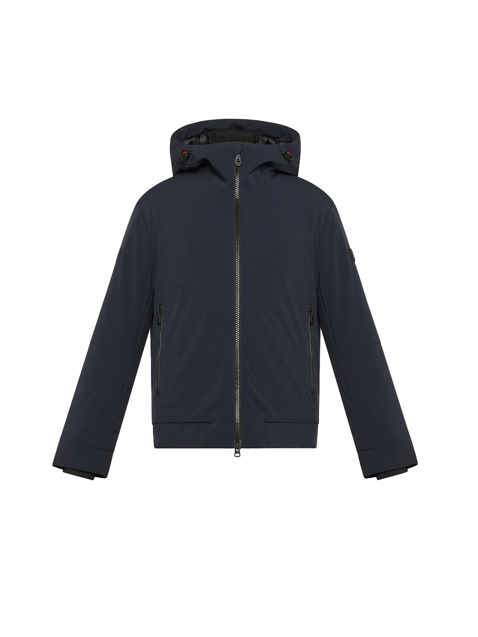 A sporty jacket with a clean design, ideal for accompanying kids in their daily outdoor activities. Made from stretch polyester canvas combined with a soft and warm polyester jersey, thanks to the fine yarns used. The synthetic padding ensures optimal thermal comfort without adding weight. The central double-slider zipper, fixed adjustable hood with drawstring, and large side pockets enhance its practicality. The black windproof cuffs in contrasting color emphasize its bold and sophisticated character while providing extra protection. The outer fabric is water-repellent with a PFC-free treatment, free from harmful chemicals for the environment. A versatile garment, perfect for enjoying every moment freely.