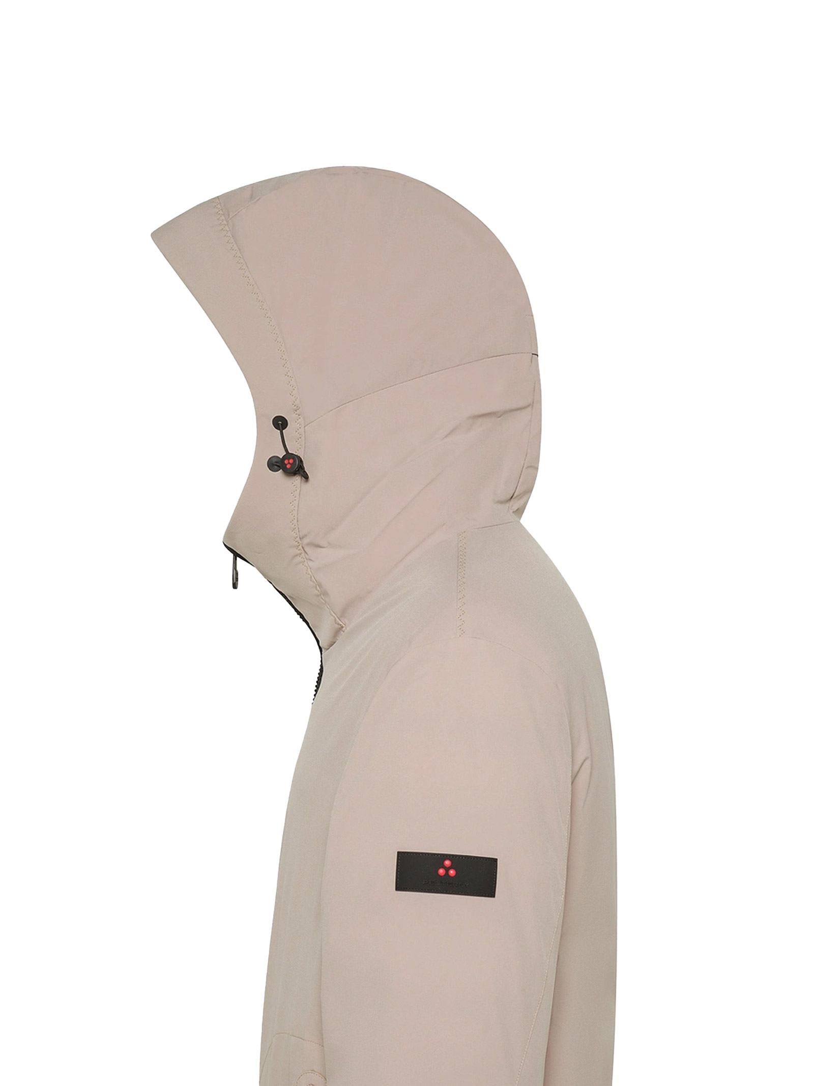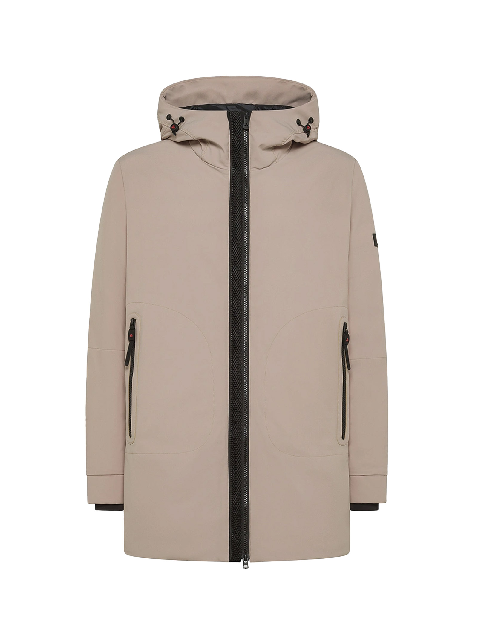 Overcoat made of stretch polyester fabric paired with a soft and warm polyester jersey, thanks to the fine yarns used. The Thermoplume padding, the first true synthetic alternative to goose down, provides warmth, lightness, softness, and compressibility, while maintaining excellent water resistance. Part of the Color line where geometric patterns come to life and enhance the section's down jackets, a playful and ironic concept that creatively and easily reinterprets outerwear. The essential and functional design is completed with black ribbed windproof cuffs, an adjustable hood with drawstrings, a black double central zipper designed to shape the garment according to your needs, and welt side pockets. The PFC Free water-repellent treatment protects against light rain without the use of harmful chemicals to the environment. A versatile garment, carefully designed to face the cold season with maximum comfort without sacrificing style.