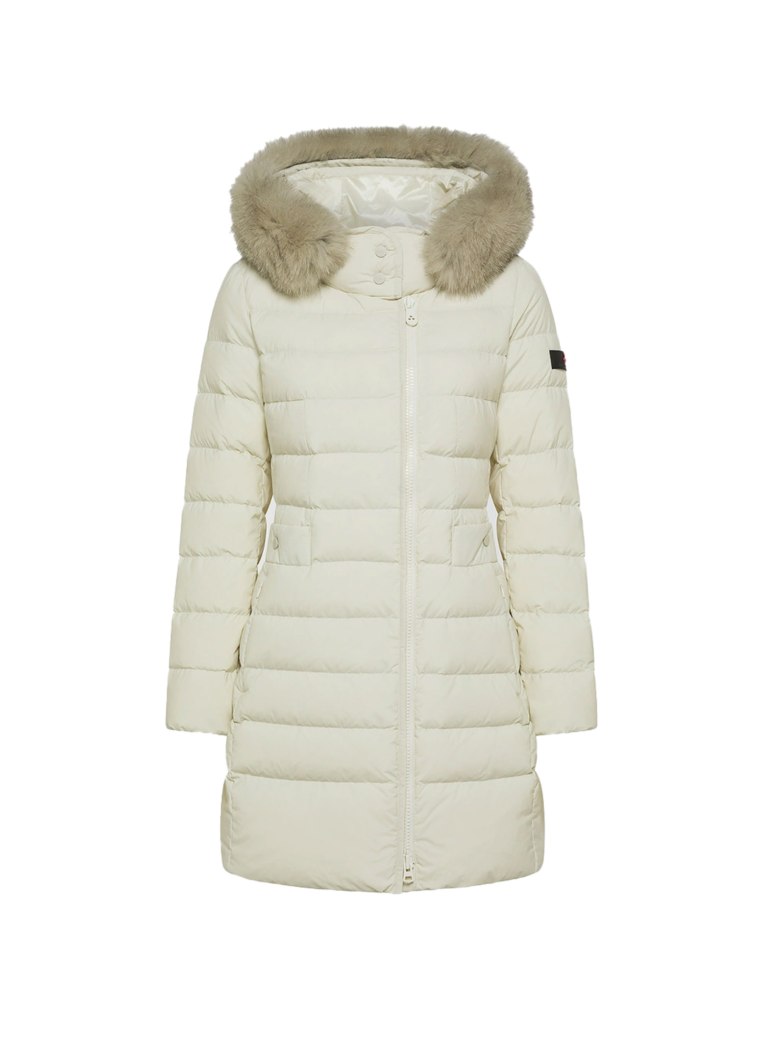 Long quilted down jacket made of lightweight nylon poplin and polyester microfiber, heat-treated to achieve a structured hand and powdery texture, then softened with a silicone finish for an ultra-smooth feel. The certified natural down filling ensures thermal insulation with minimal weight, while the water-repellent treatment maintains comfort even in light rain. The design features a central two-way zipper, an enveloping high collar with tone-on-tone snap buttons, and a hood with removable fox fur trim. Side pockets with snap buttons complete this refined yet functional piece, ideal for winter in the city. An iconic model of the brand, reinterpreted with even more modern and sophisticated details.