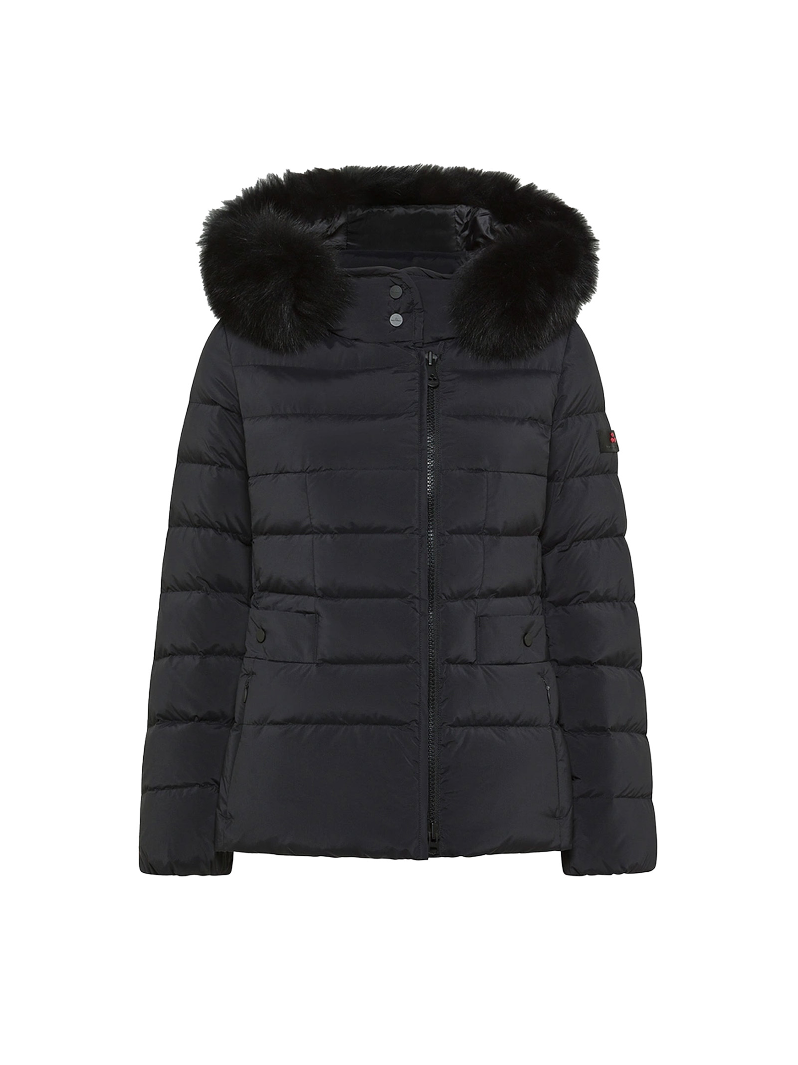 Short and soft down jacket made of lightweight nylon poplin and polyester microfiber, treated at high temperature to achieve a firm touch and a powdery feel, further softened by a final silicone treatment. The channel quilting with certified natural down filling ensures warmth and lightness, while the hood with detachable fox fur trim adds a sophisticated touch. The asymmetric central zip gives movement to the essential and feminine shape, completed by a collar with double snap buttons in tone and side pockets with hidden snap closures. Water repellent, designed to accompany your movements, providing maximum protection on the coldest days.