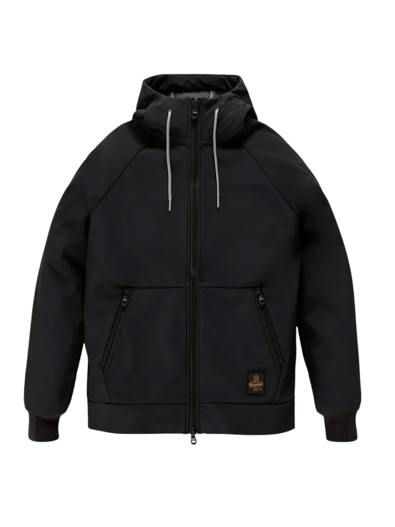 This garment includes technical elements and functional details such as elastic cuffs with technical Lycra inserts, an adjustable hood with drawstrings, and a front zipper with double slider.