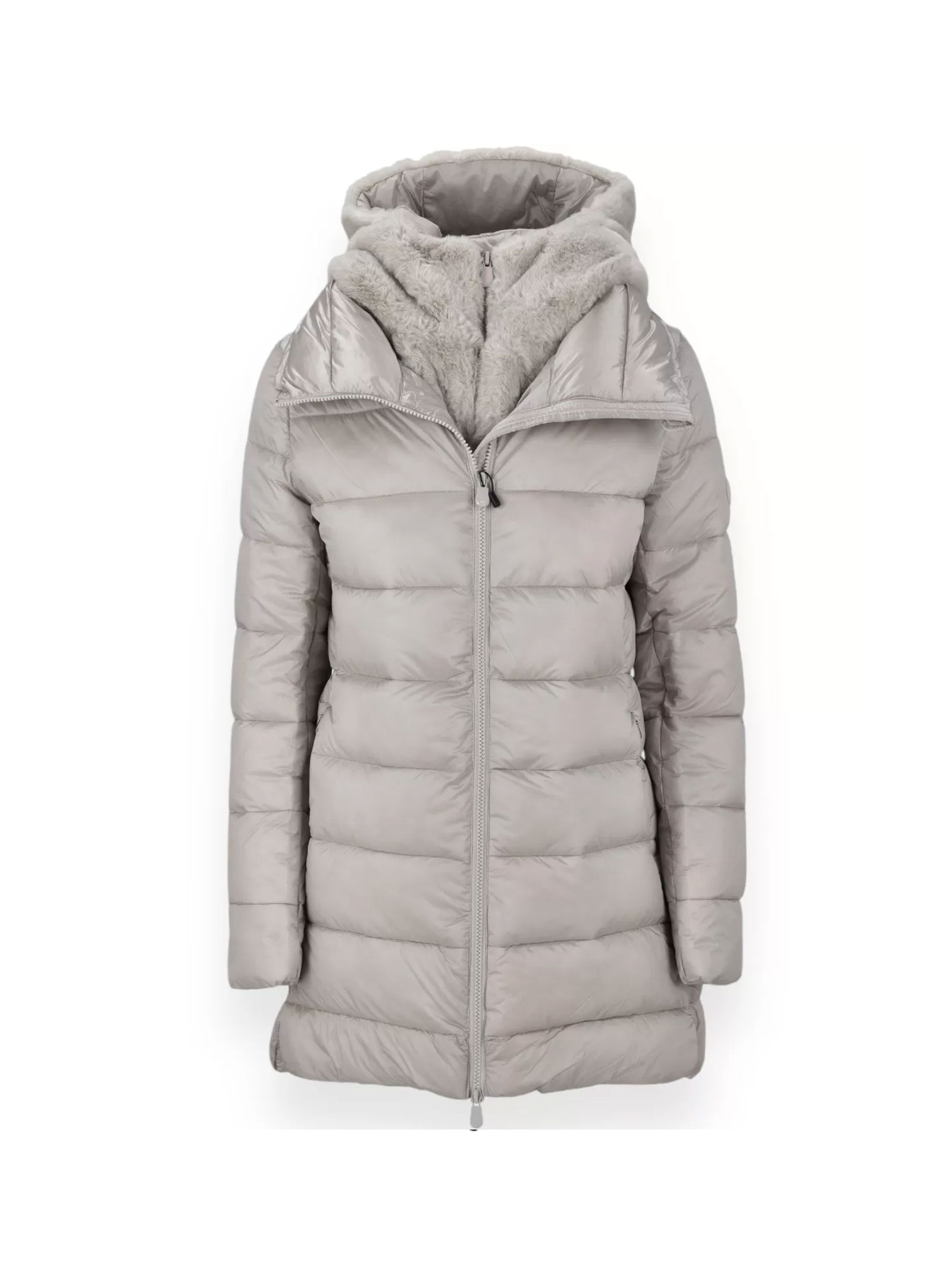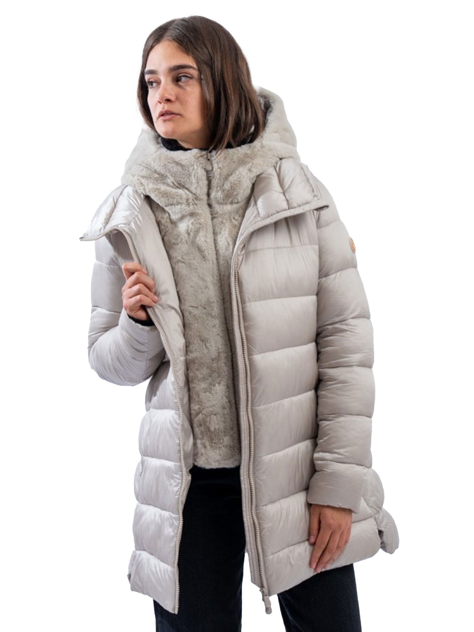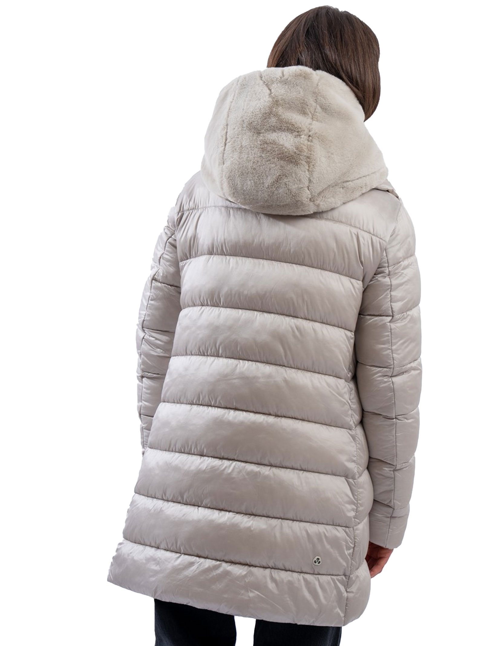 Matilda is an A-line puffer jacket made from recycled nylon with a shiny finish. This quilted model features a removable hood and front flap in tone-on-tone faux fur, adding an extra touch of style and softness. It has a double-slider zip with a custom puller, hidden zip pockets, and a round logo on the sleeve.