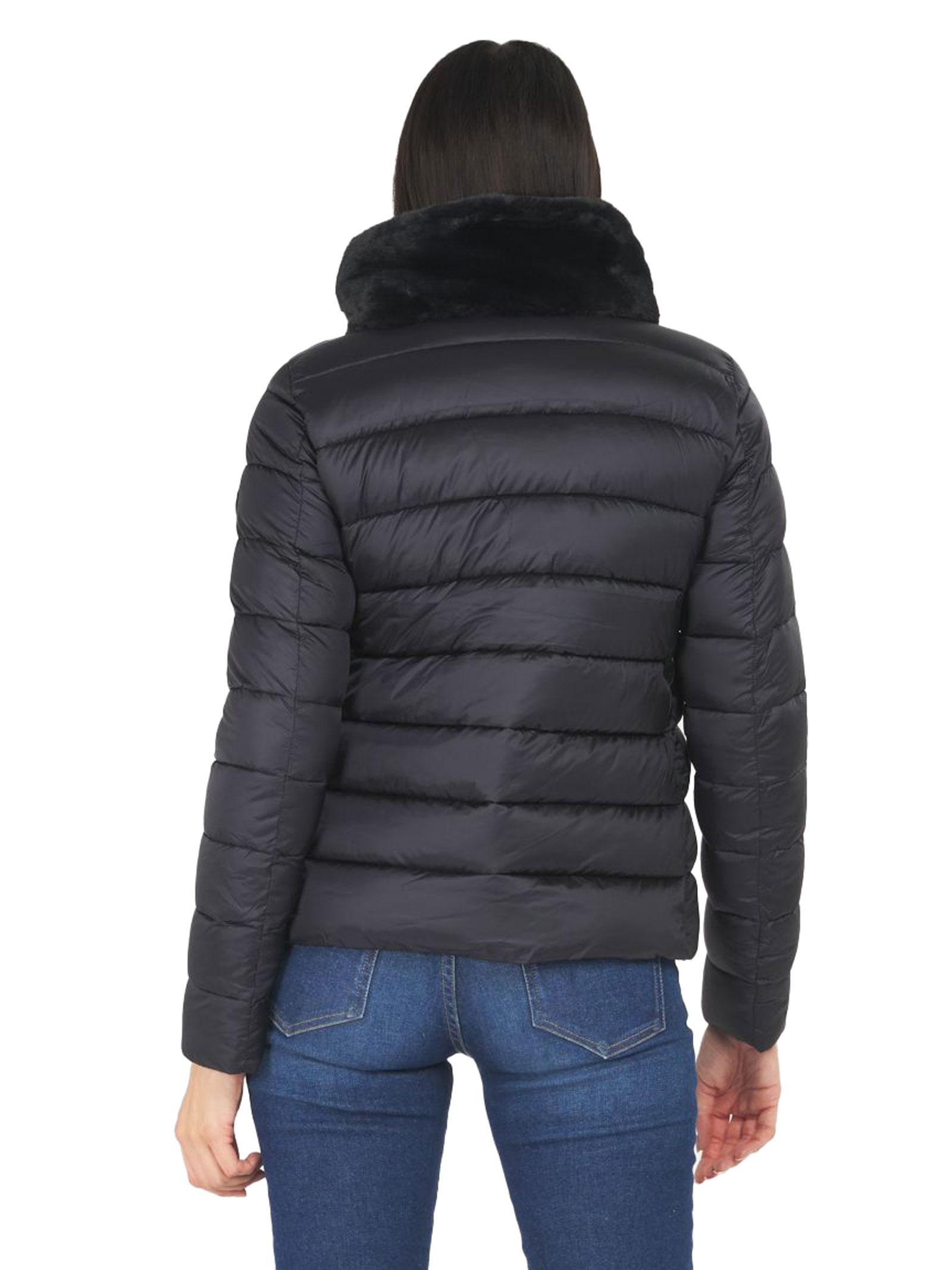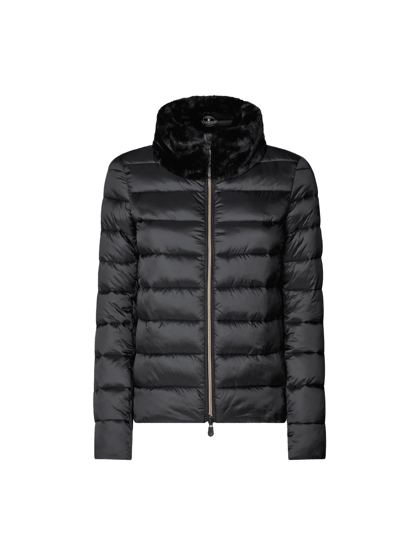 Insulated jacket made without any animal-derived materials, featuring a faux fur collar.