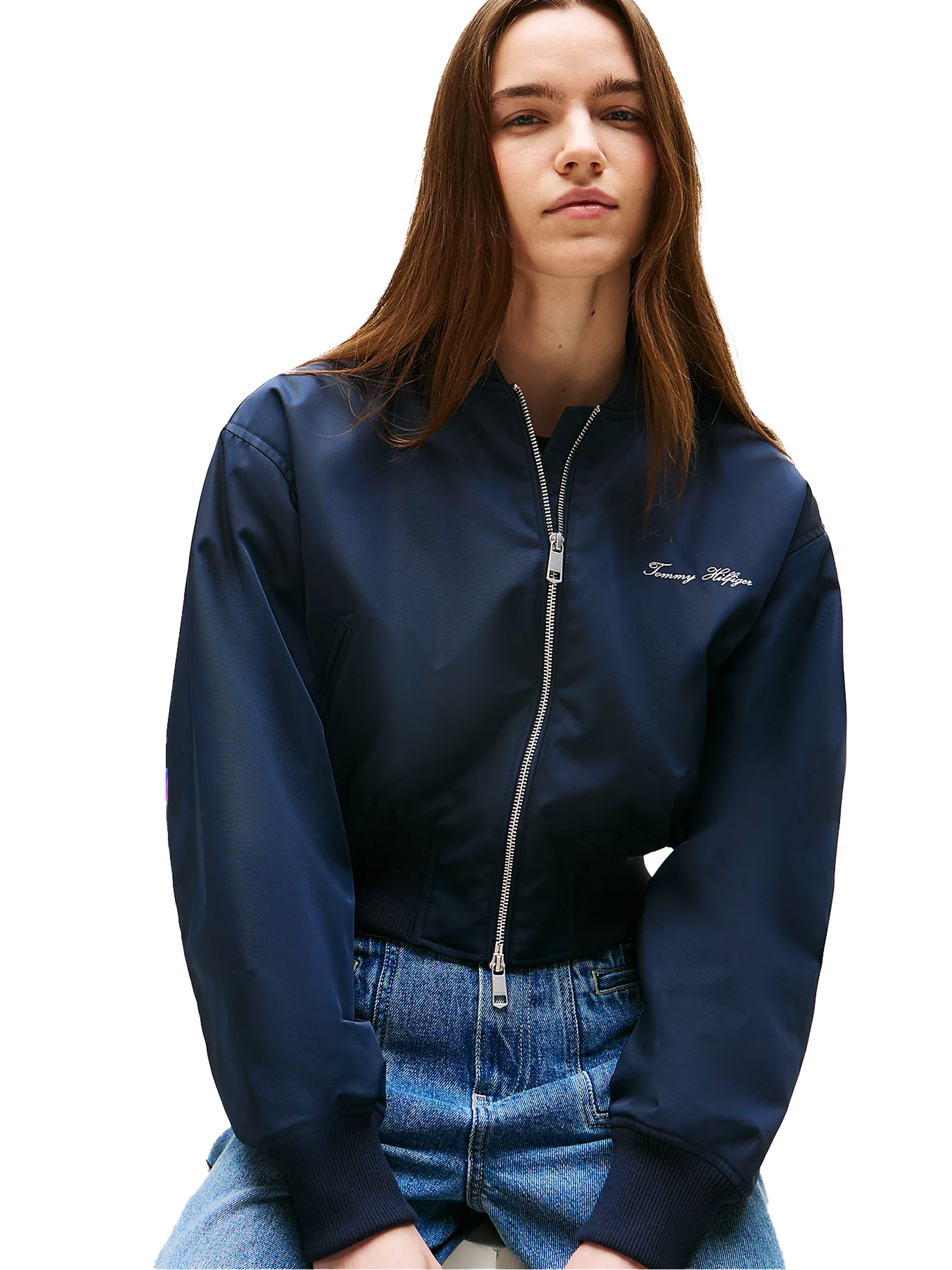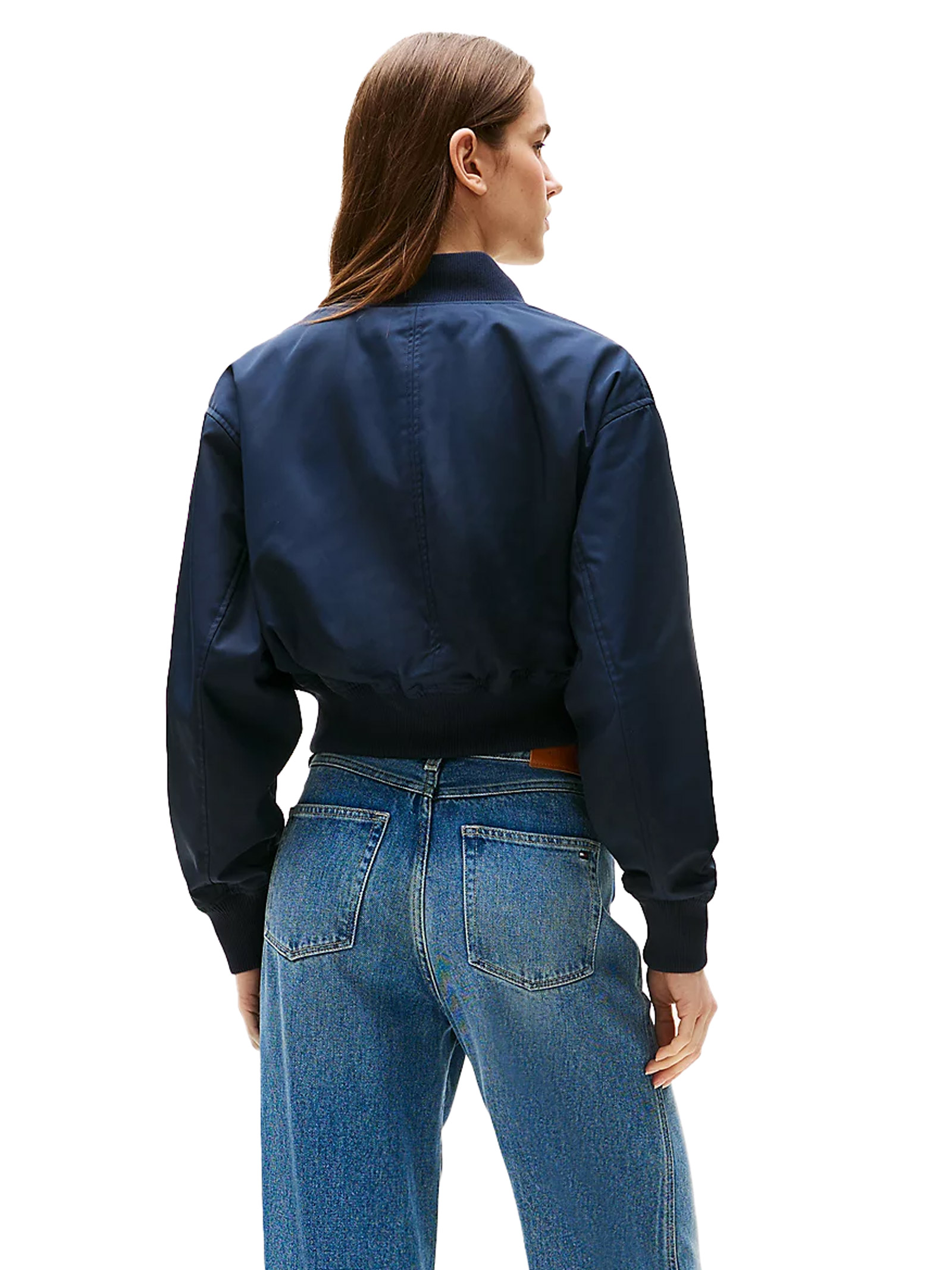 This crop bomber jacket with a full zip, lightly padded and made from practical water-repellent fabric, is a must-have piece for rainy days.