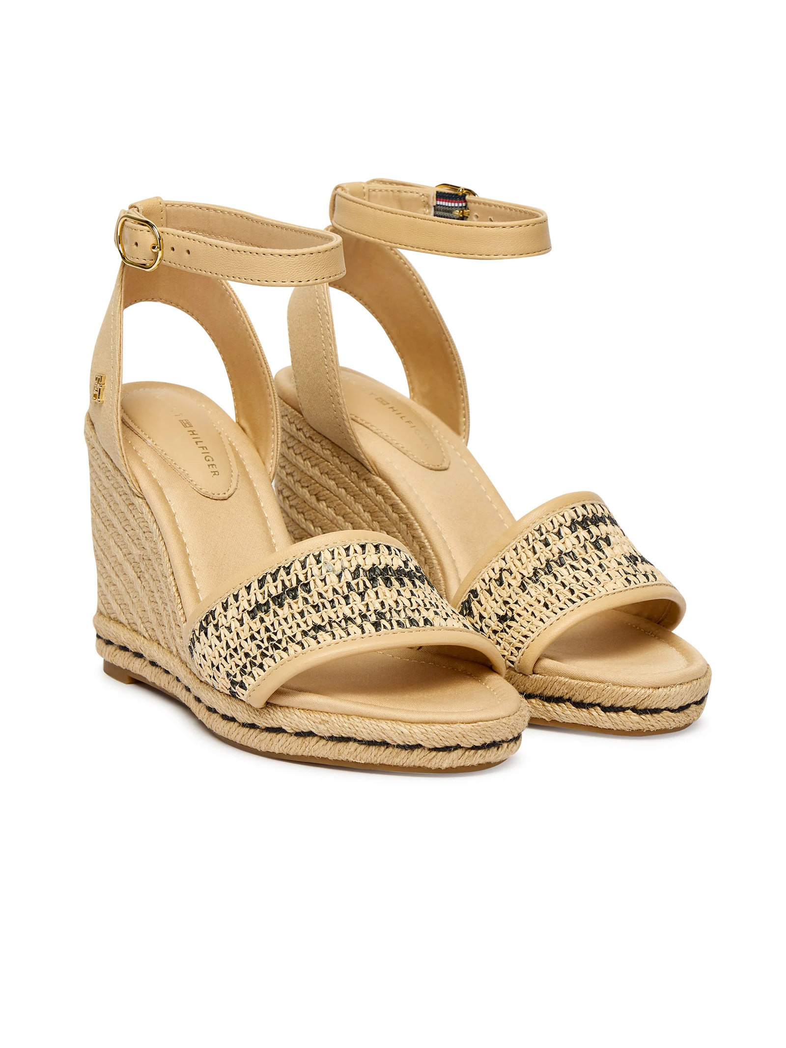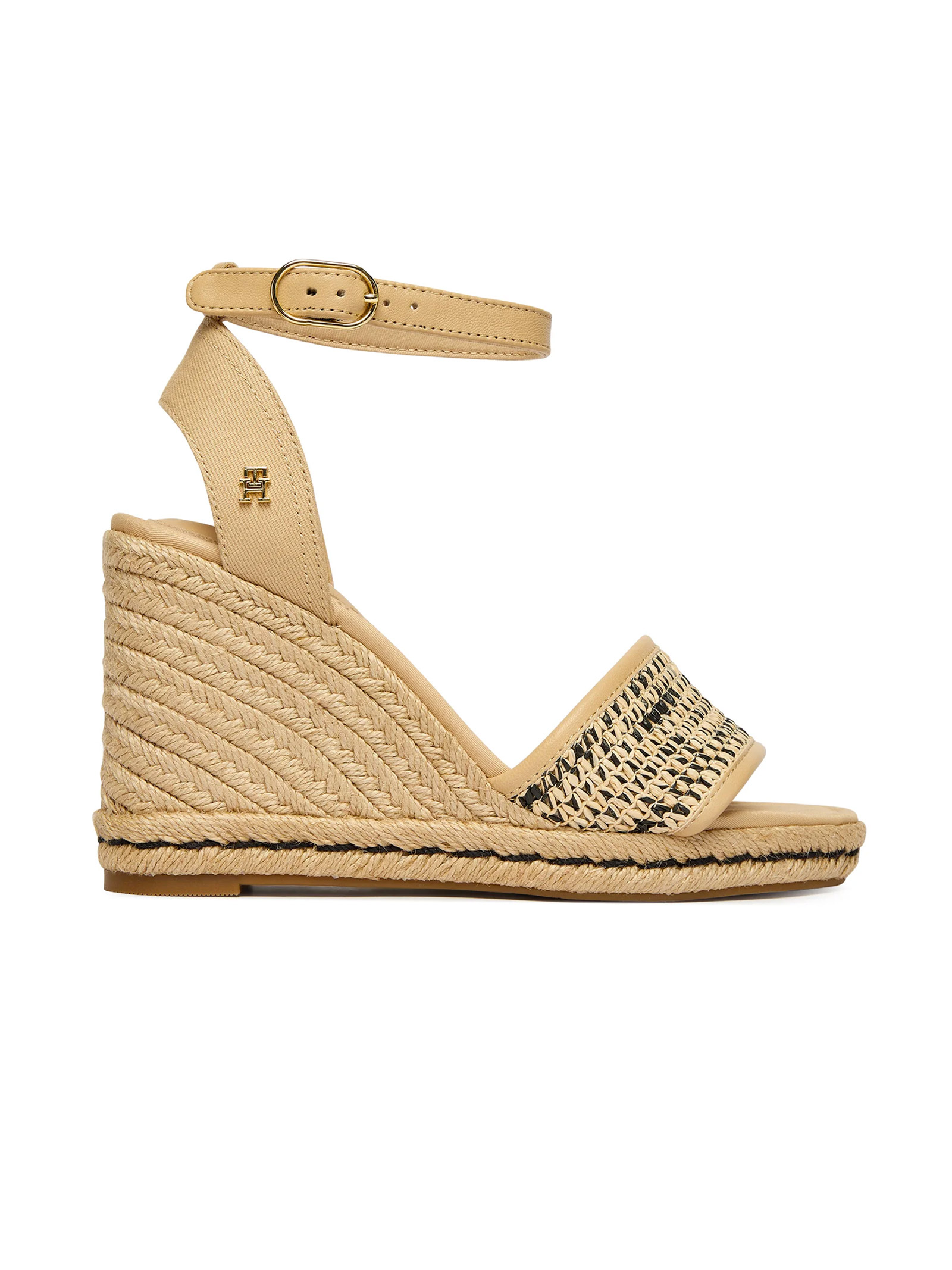 These high sandals are balanced by a sturdy wedge heel and a secure ankle strap, while the raffia and jute finishes add a touch of texture.