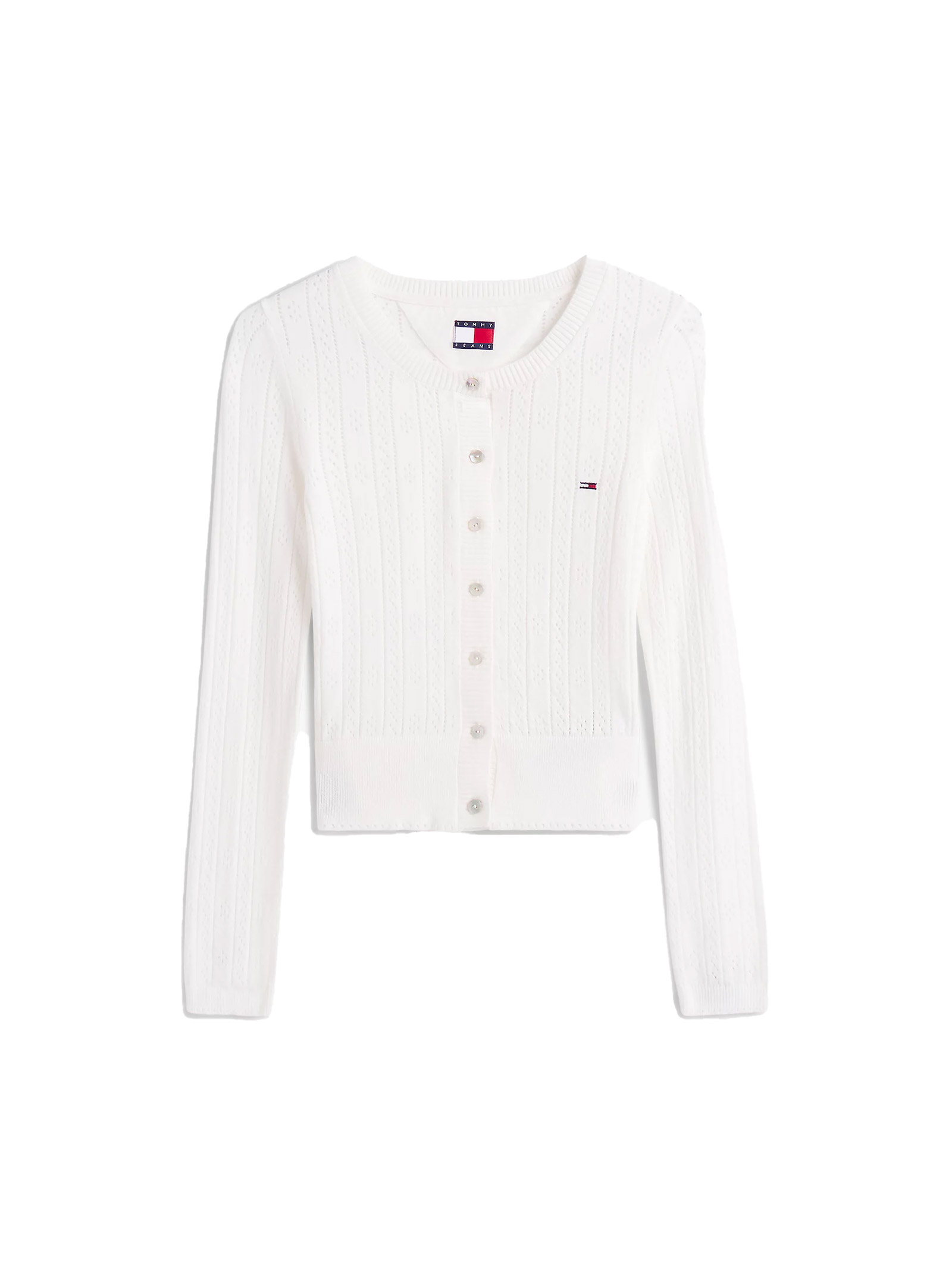 The classic cardigan with an all-over pointelle pattern, enhanced by iconic details, perfectly interprets vintage style.