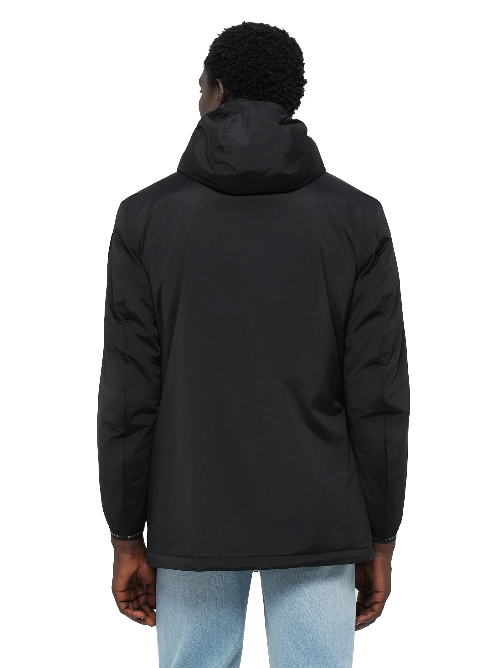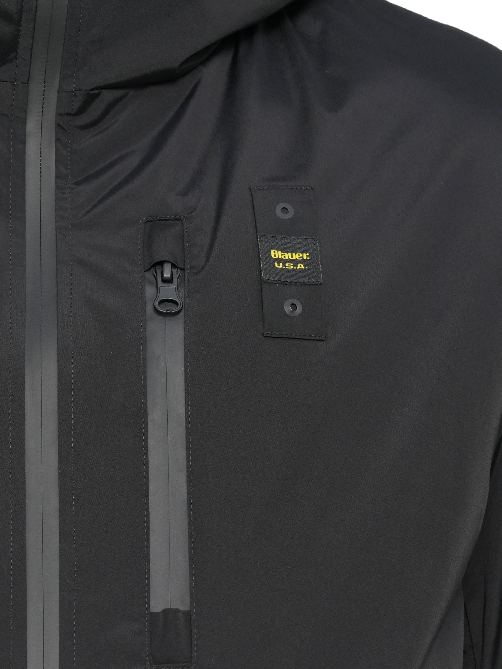 Giubbotto lungo in nylon doppio strato, liscio leggero ed idrorepellente con cappuccio fisso. Interno in morbida pelliccia ecologica in contrasto colore che dona calore e morbidezza. Taschino con zip spalmata sul petto.