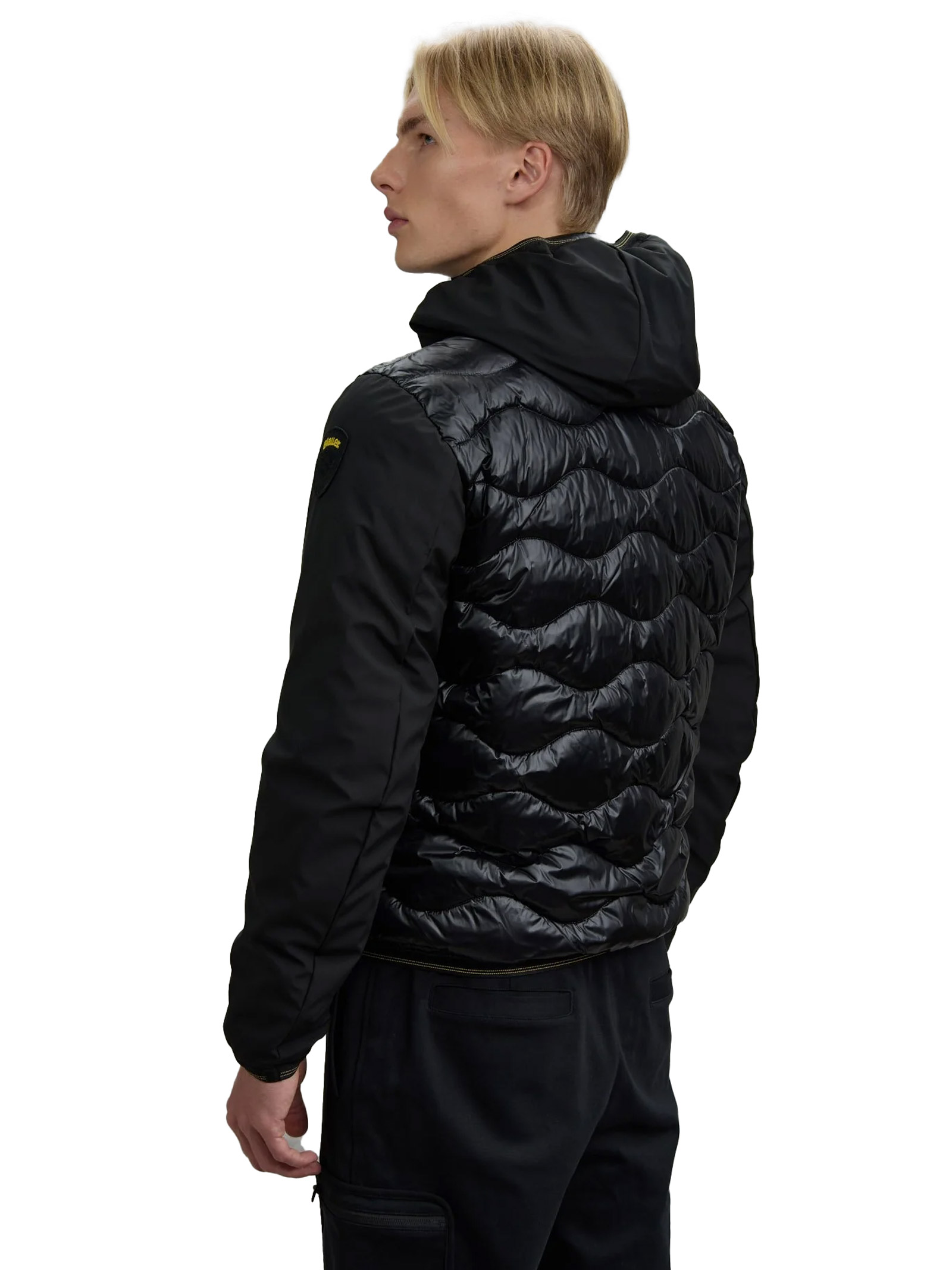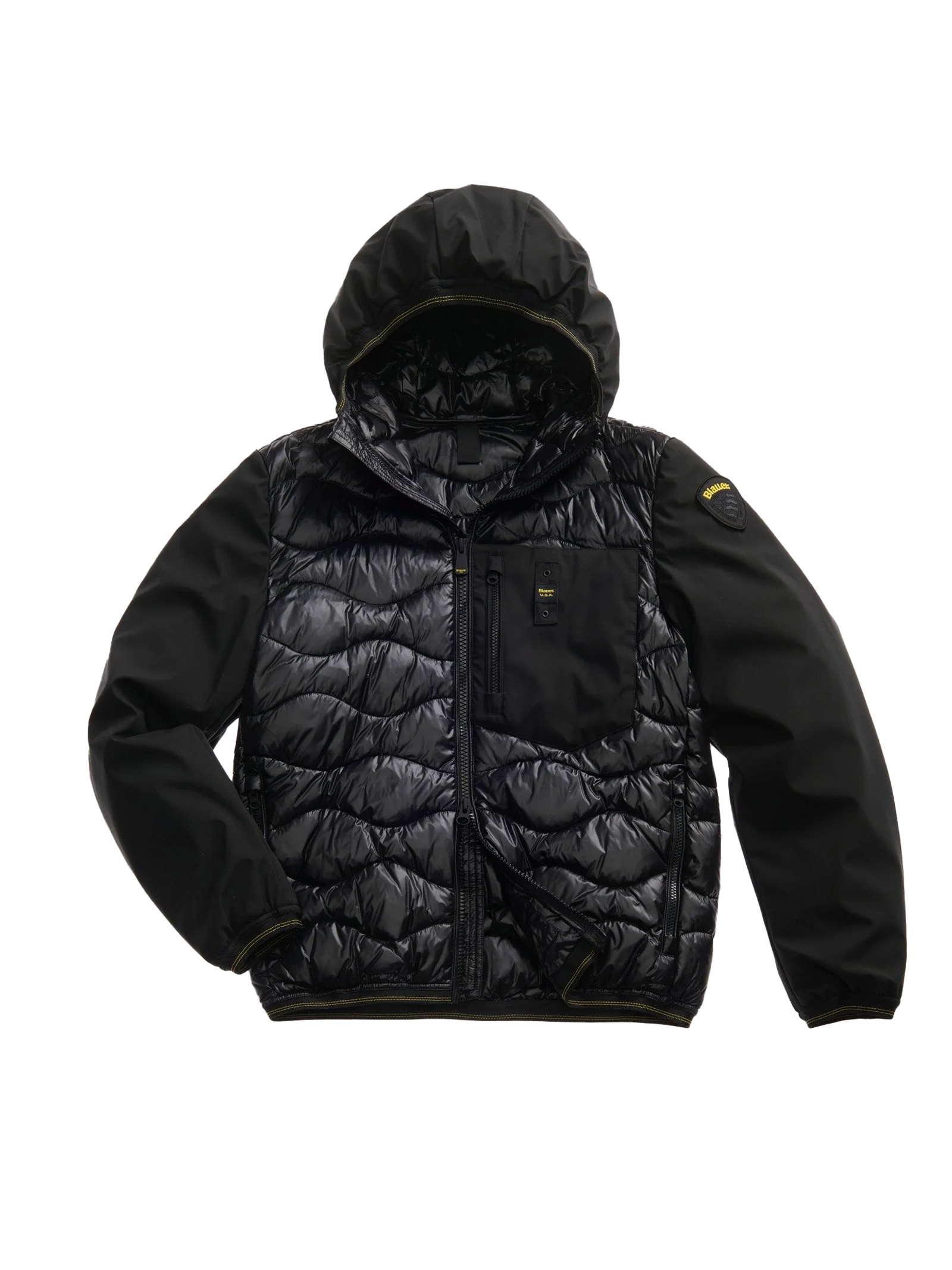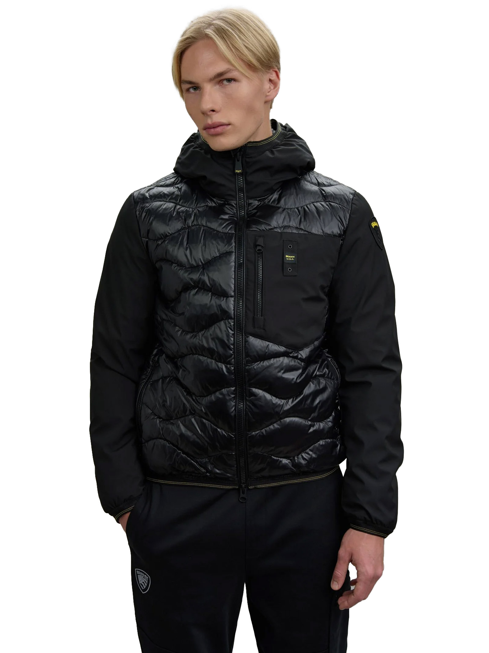 Piumino monocromatico in neoprene leggero e liscio sulle maniche e nylon lucido con trapuntatura a onde sul corpo. Imbottitura mista per tenerti al caldo anche in condizioni climatiche avverse.