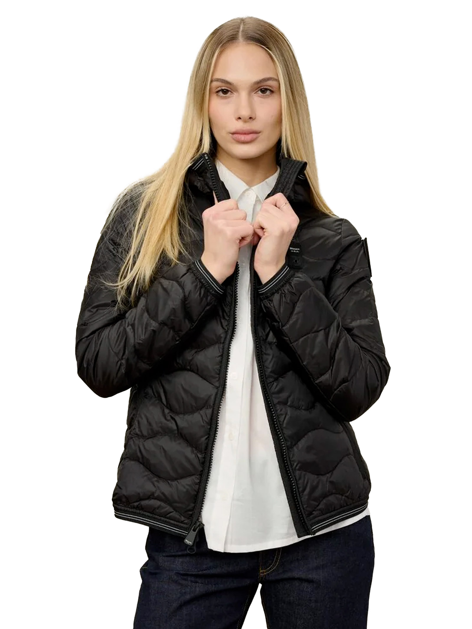 Piumino con cuciture ad onde orizzontali con fodera in tono. Imbottitura leggera in morbida piuma e taglio svasato per risaltare la figura.