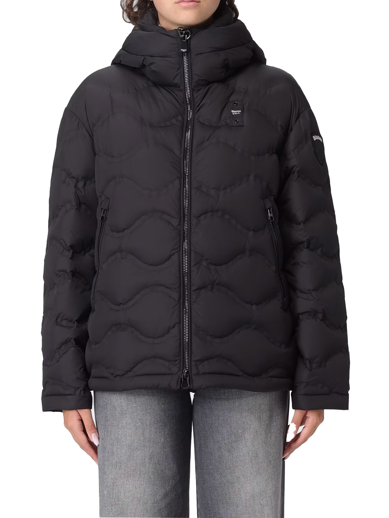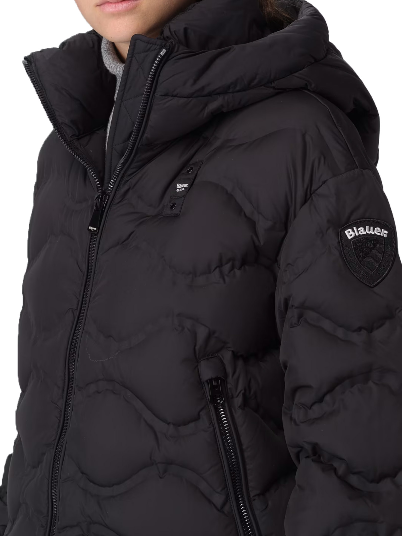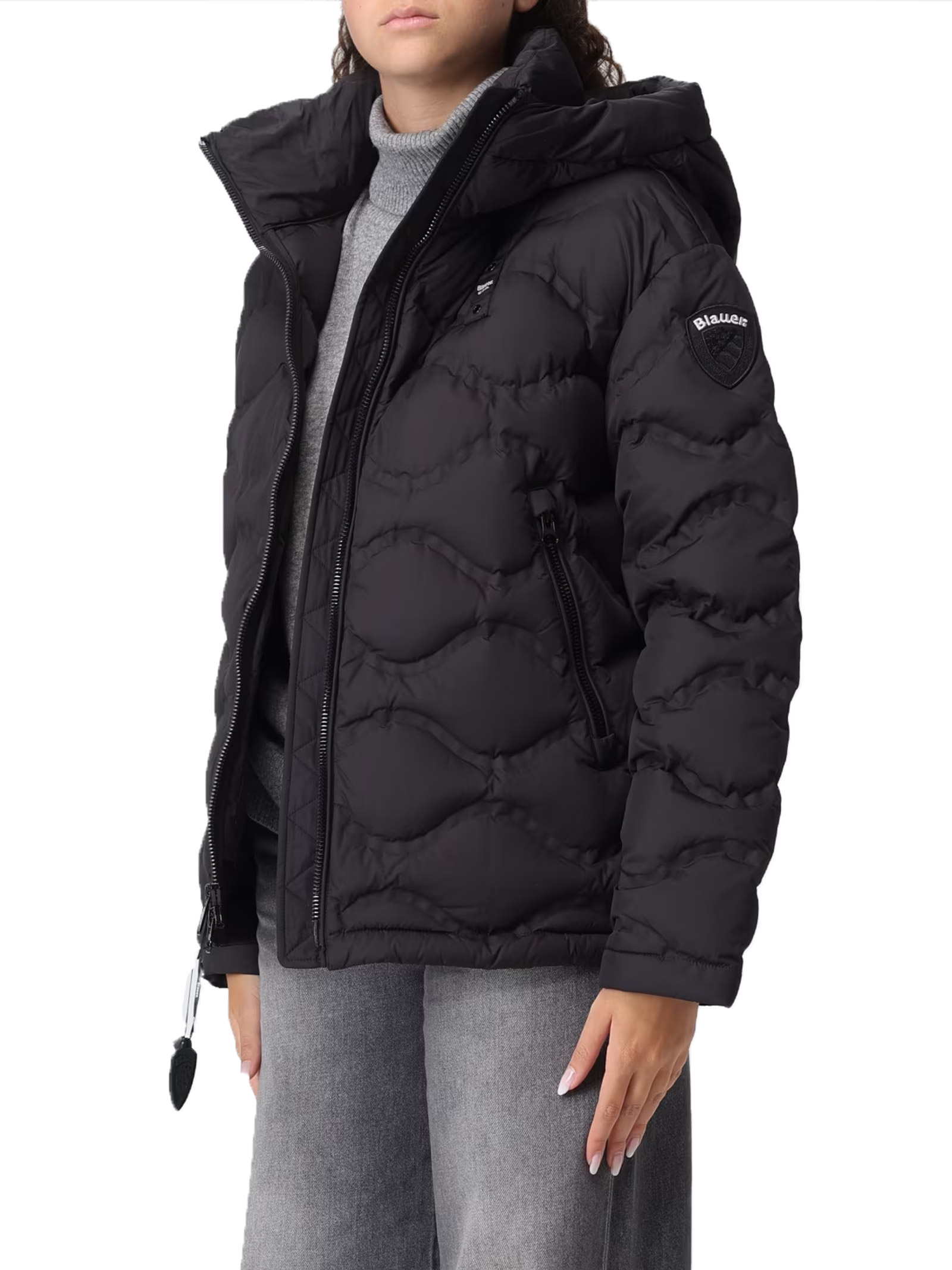 Piumino ad onde termosaldate con imbottitura calda e non ingombrante. Capo elegante dal doppio colletto caldo e avvolgente.