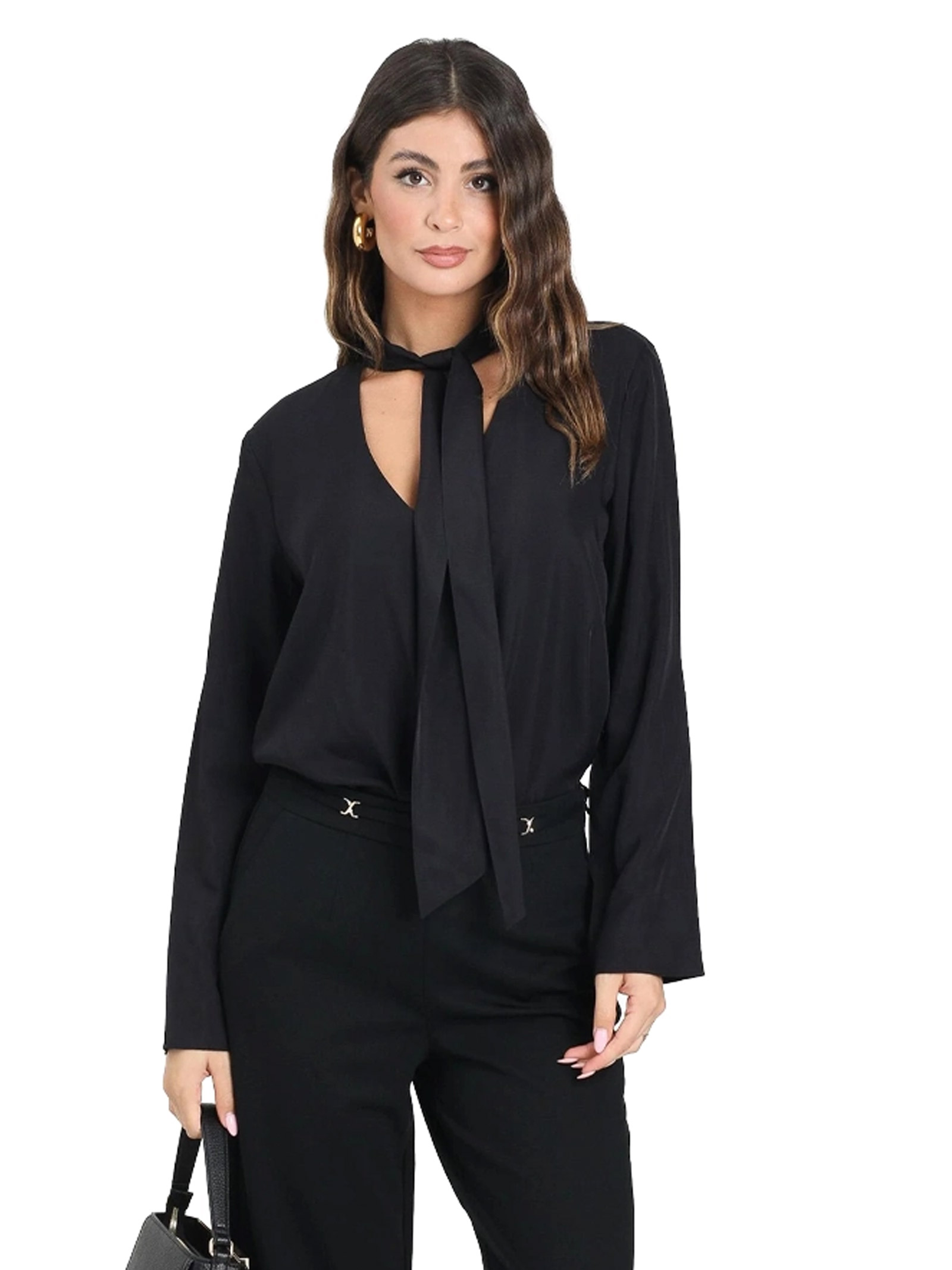 Camicia da donna Armani Exchange a maniche lunghe con scollo a V e fiocco, realizzata in viscosa e senza bottoni. La modella indossa una taglia S ed è alta 170 cm.
