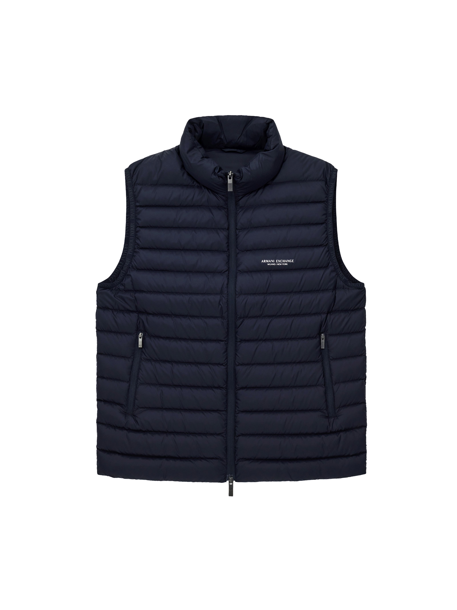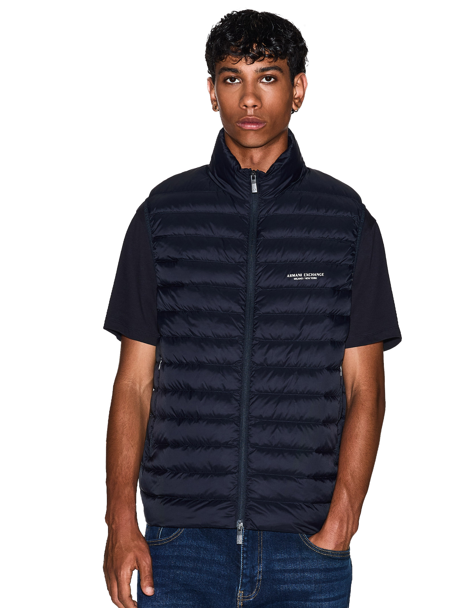 Piumino smanicato realizzato con esterno in nylon resistente e una calda imbottitura in piumino, il capo perfetto per affrontare le mezze stagioni con stile e leggerezza. Questo piumino smanicato si distingue per la sua trapuntatura orizzontale che garantisce una distribuzione uniforme del calore e per il suo design versatile. Il collo alto protegge dal vento, mentre la chiusura frontale con zip e le tasche laterali con zip aggiungono funzionalità. Il logo "Armani Exchange Milano / New York" stampato a contrasto sul petto firma il capo con un tocco iconico.