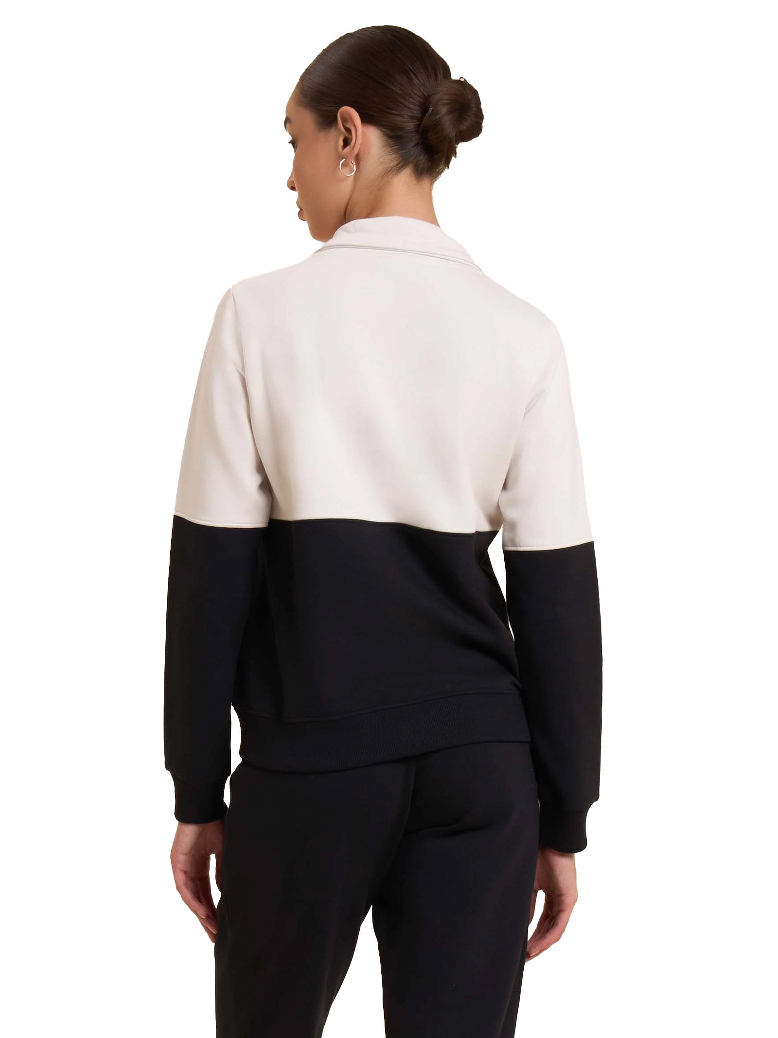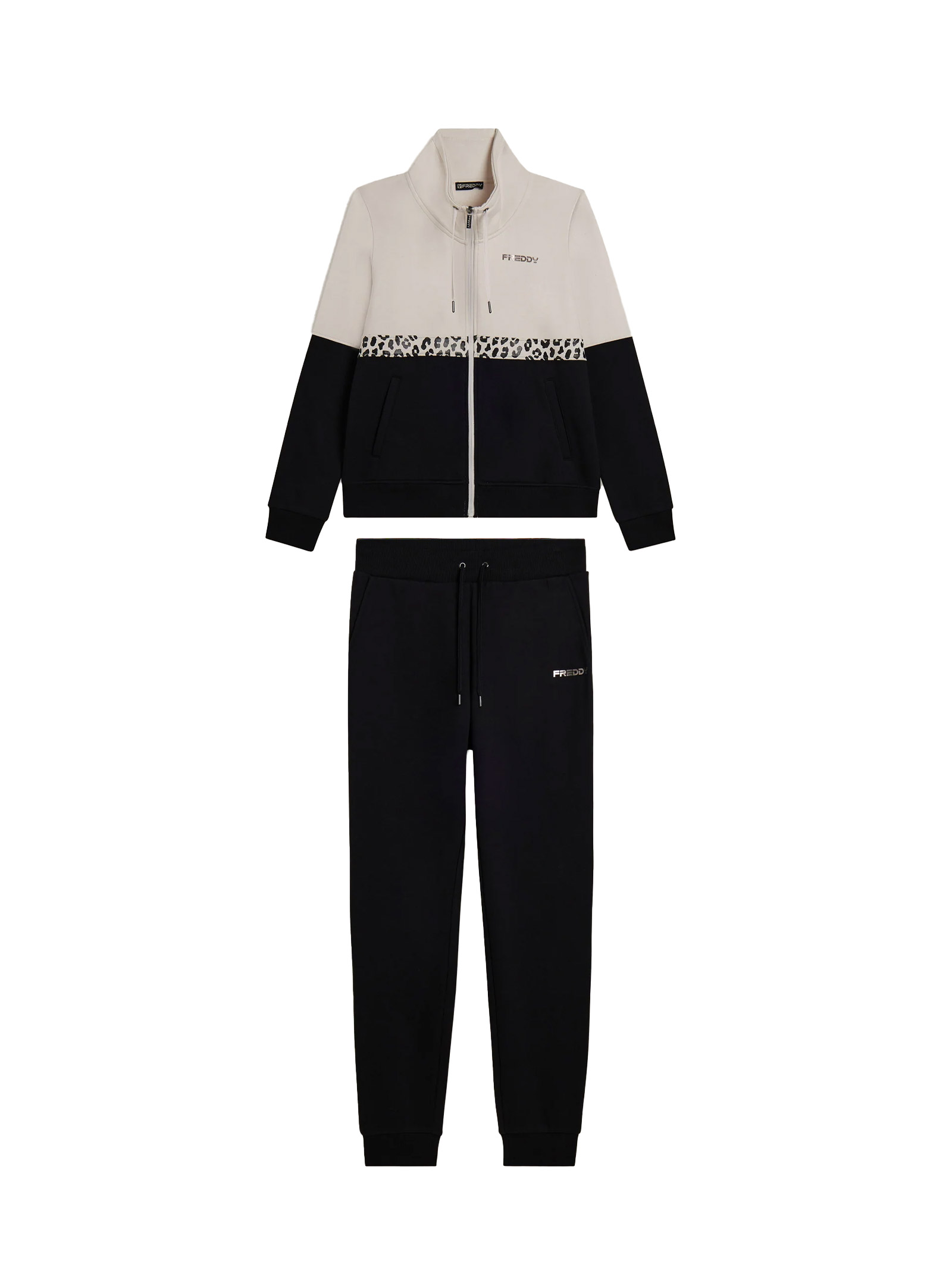 Tuta grintosa e confortevole in felpa garzata elasticizzata, perfetta per le attività quotidiane. La felpa con zip ha una fascia in costina sul fondo, collo alto con coulisse e maniche lunghe con polsini. Al centro del busto è presente uninserto animalier che aggiunge carattere al look. I pantaloni hanno gamba con fondo a polsino in costina, vita elasticizzata con coulisse e una linea fluida. Il logo Freddy è stampato sul petto e sul fianco sinistro dei pantaloni. Entrambi i capi sono dotati di tasche.