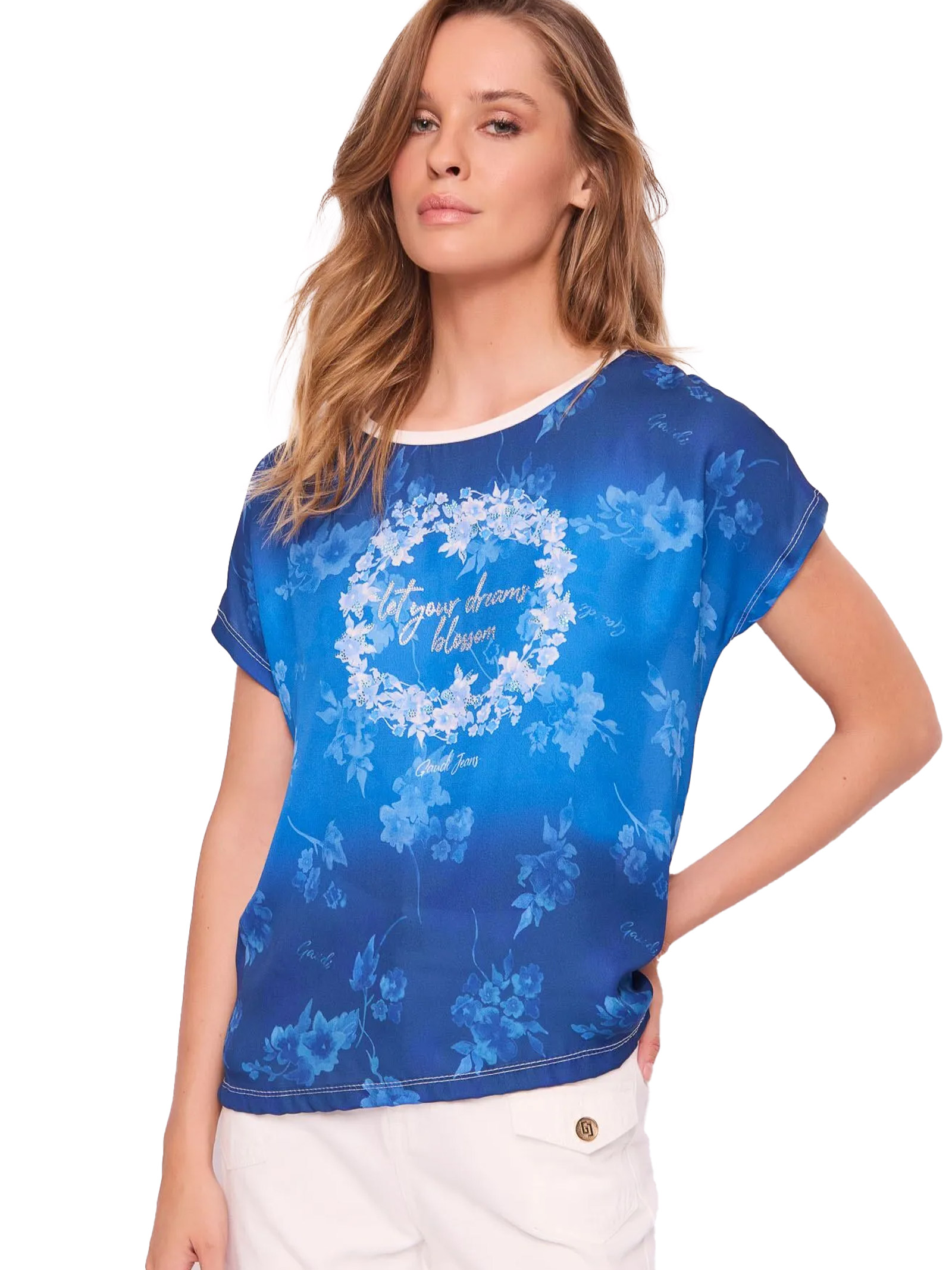 Scegli la t-shirt in jersey elasticizzato con inserto in georgette stampata e strass. Un mix perfetto di stile e unicità.