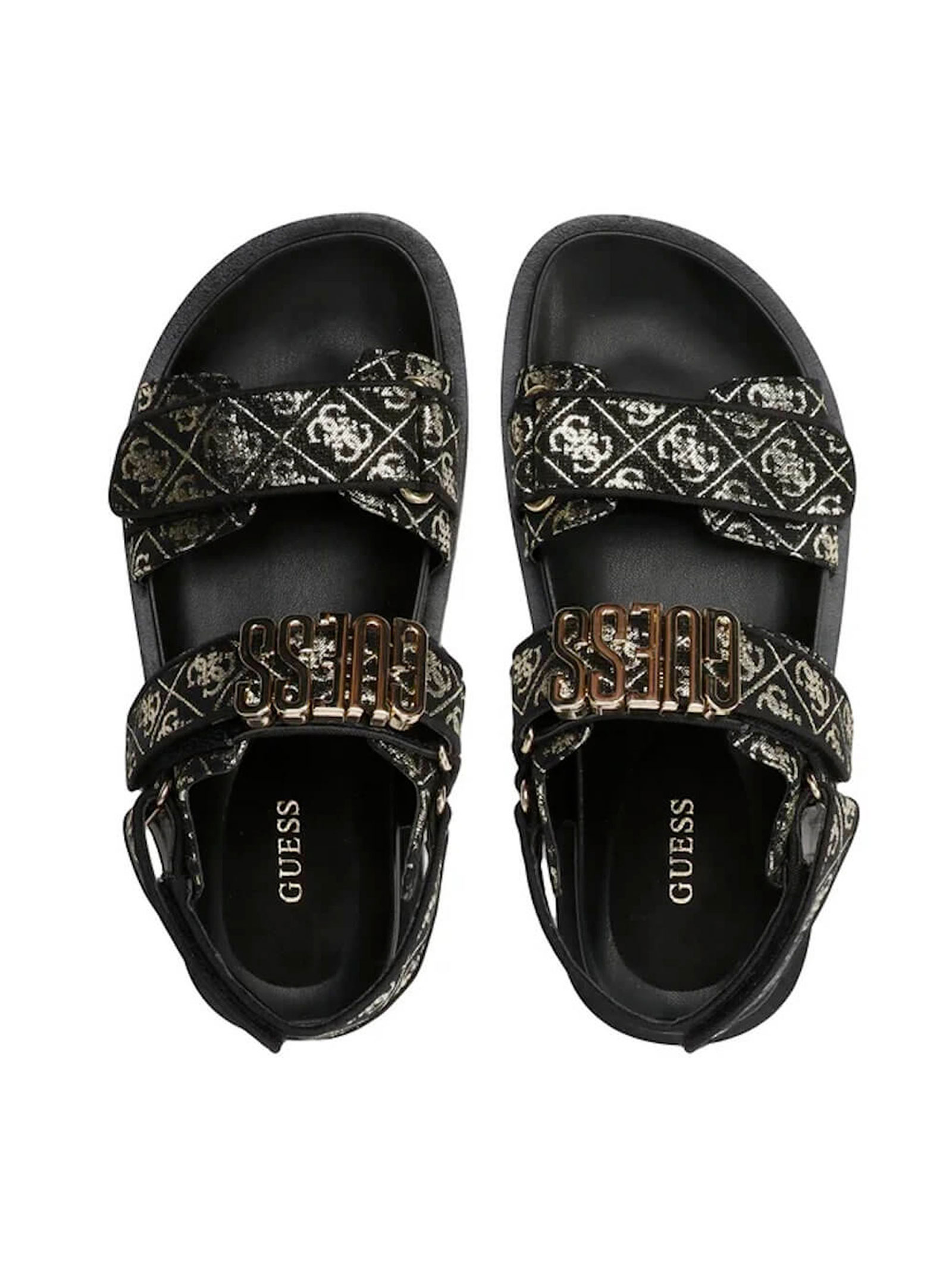 Sandali flat da donna by GUESS realizzati in tessuto di ottima qualità colore nero con stampa 4G ripetuta e peonie all over in sfumature dorate. Suola testurizzata e adesivi per una migliore vestibilità. Ha una fibbia metallica dorata sul cinturino con il logo GUESS.