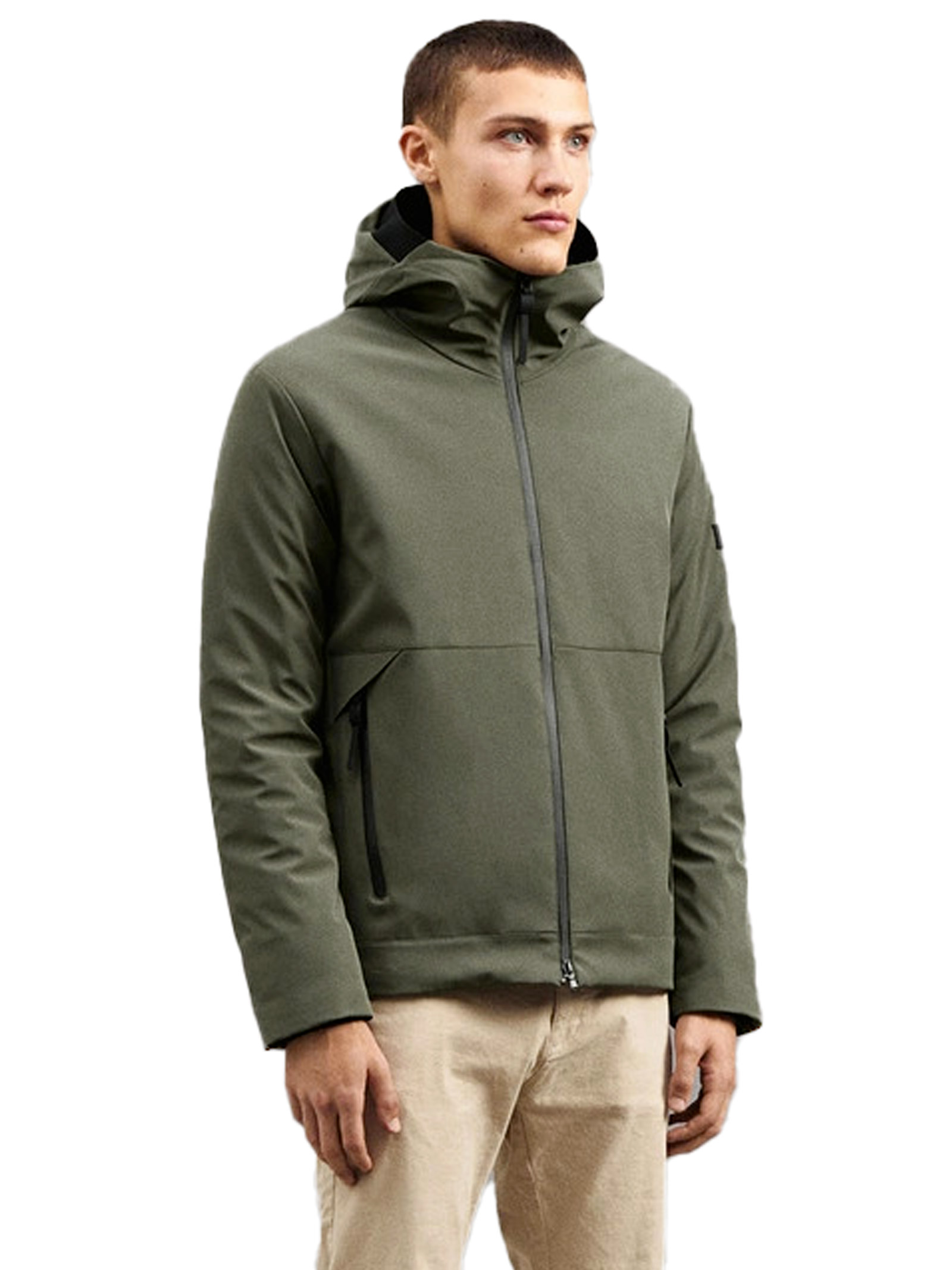 Bomber liscio in nylon elasticizzato accoppiato a un jersey di nylon soffice e caldo, con imbottitura in Primaloft. Full zip centrale nera spalmata, con doppio cursore, collo in piedi con profilo nero, tasche laterali e polsini antivento. Adatto alla mezza stagione, il modello è un mix perfetto tra la praticità della felpa e la finitezza del piumino.
