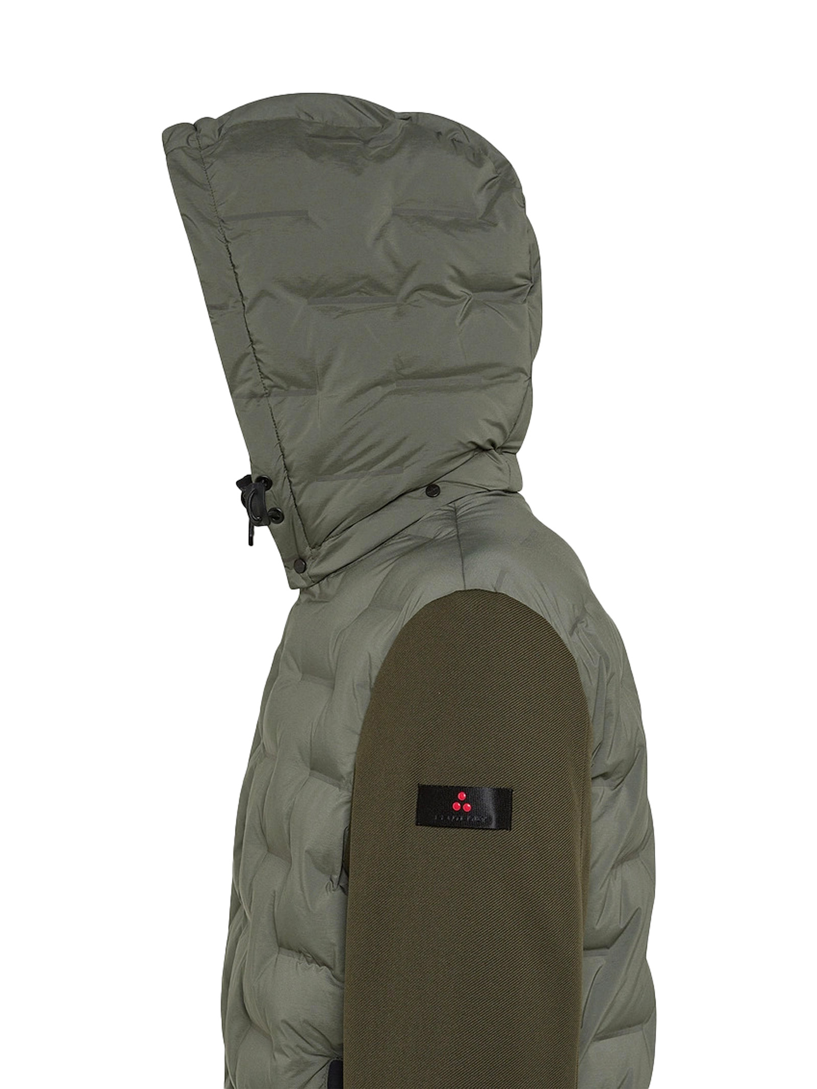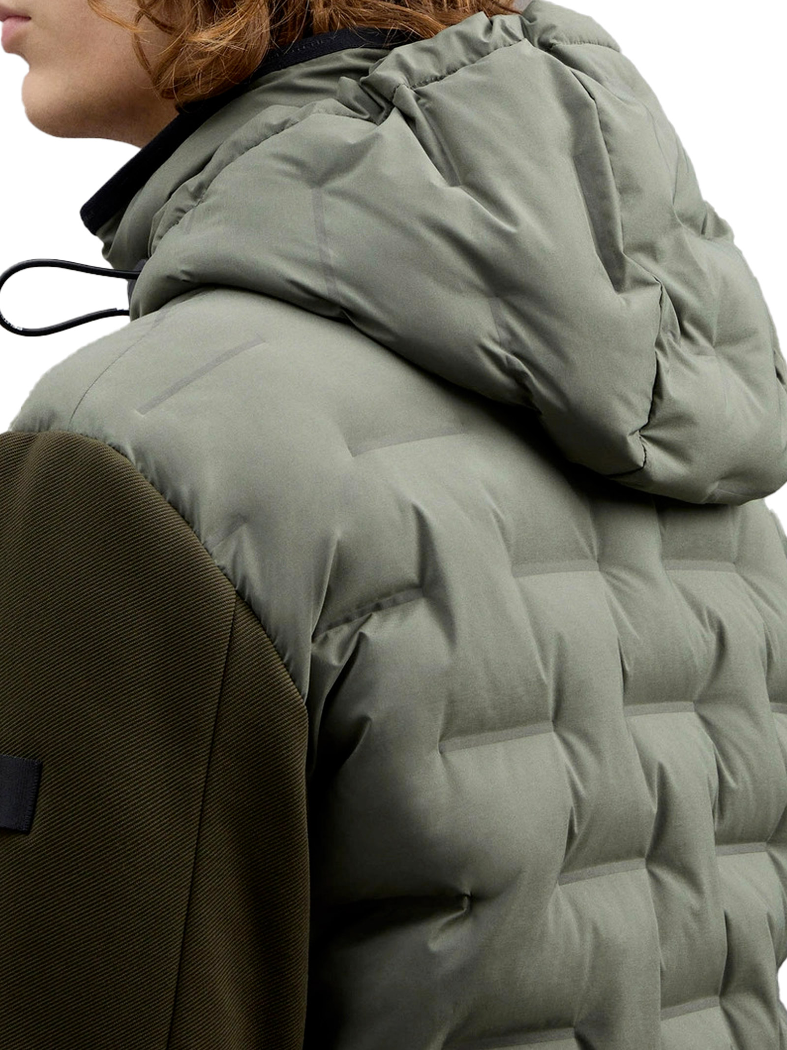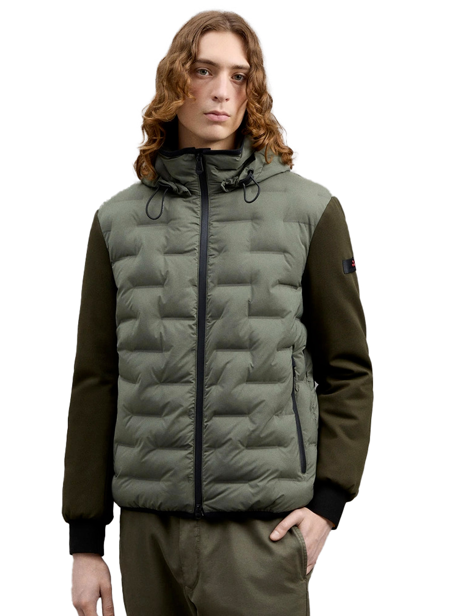 Giacca in doppio materiale: tessuto principale in jacquard poliestere stretch che, grazie a una speciale tintura, presenta un aspetto unico e una differente colorazione tra il dritto e il rovescio e lesterno. Il tessuto secondario è un drill tecnico in nylon elasticizzato con un interno garzato, che offre un comfort estremo e un aspetto caldo e ricco. Lunicità del capo è completata da dettagli funzionali: zip centrale a doppio cursore, collo alto, cappuccio staccabile regolabile, polsini antivento e due tasche laterali. Limbottitura in Thermoplume certificata GRS dona al capo la naturale morbidezza, leggerezza e comprimibilità della piuma naturale. Idrorepellente. Un capo studiato in ogni minimo dettaglio per vivere la stagione fredda con il massimo del comfort e dello stile grazie al particolare motivo del tessuto jacquard.