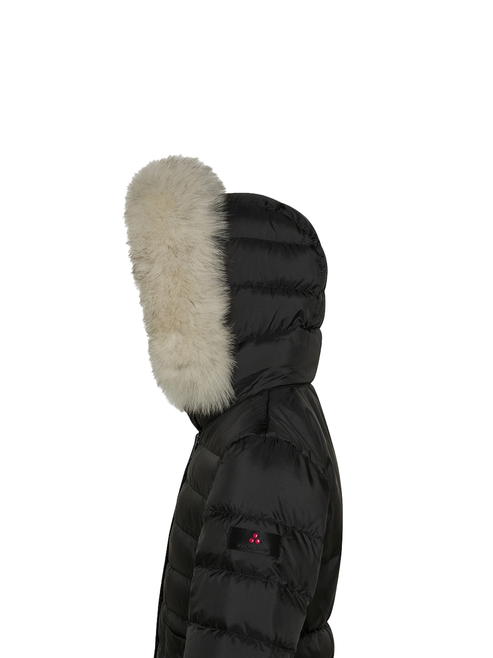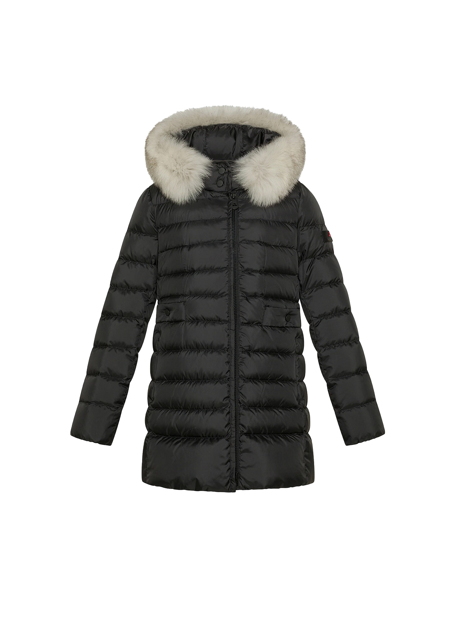 Piumino lungo trapuntato in tessuto superleggero e compatto, realizzato in 100% poliestere riciclato post consumo, con finitura semi-opaca e touch ultra morbido. Limbottitura in piuma naturale certificata assicura calore e leggerezza. Il design essenziale è arricchito dalla zip asimmetrica con doppio cursore e dal cappuccio con pelliccia di volpe removibile, per un tocco sofisticato. Le tasche laterali a filetto completano il look. Trattato con finitura idrorepellente PFC Free, senza sostanze chimiche nocive, è un modello iconico del brand Peuterey, ideale per le più piccole fashion-addicted che desiderano affrontare linverno con stile e comfort.
