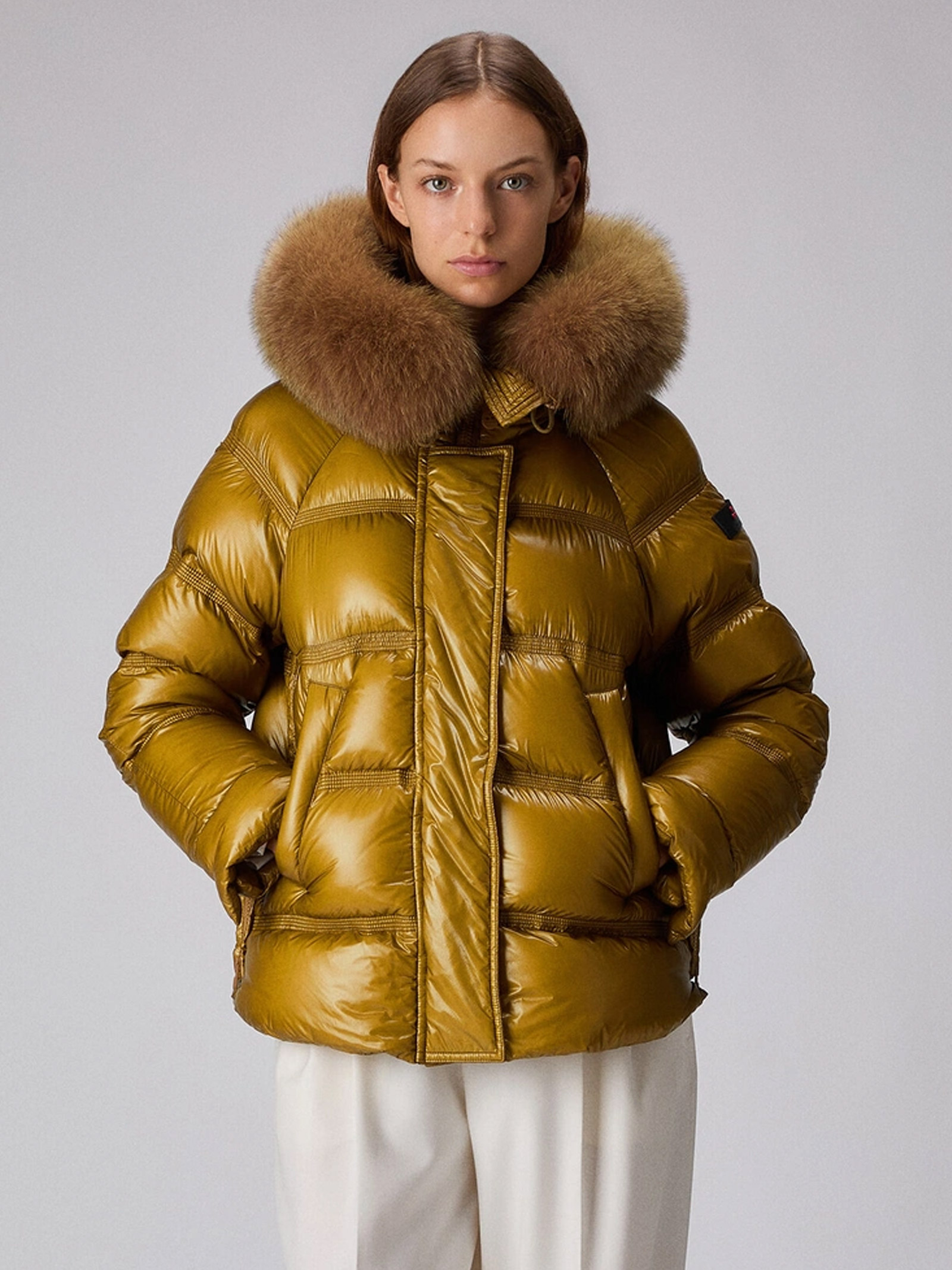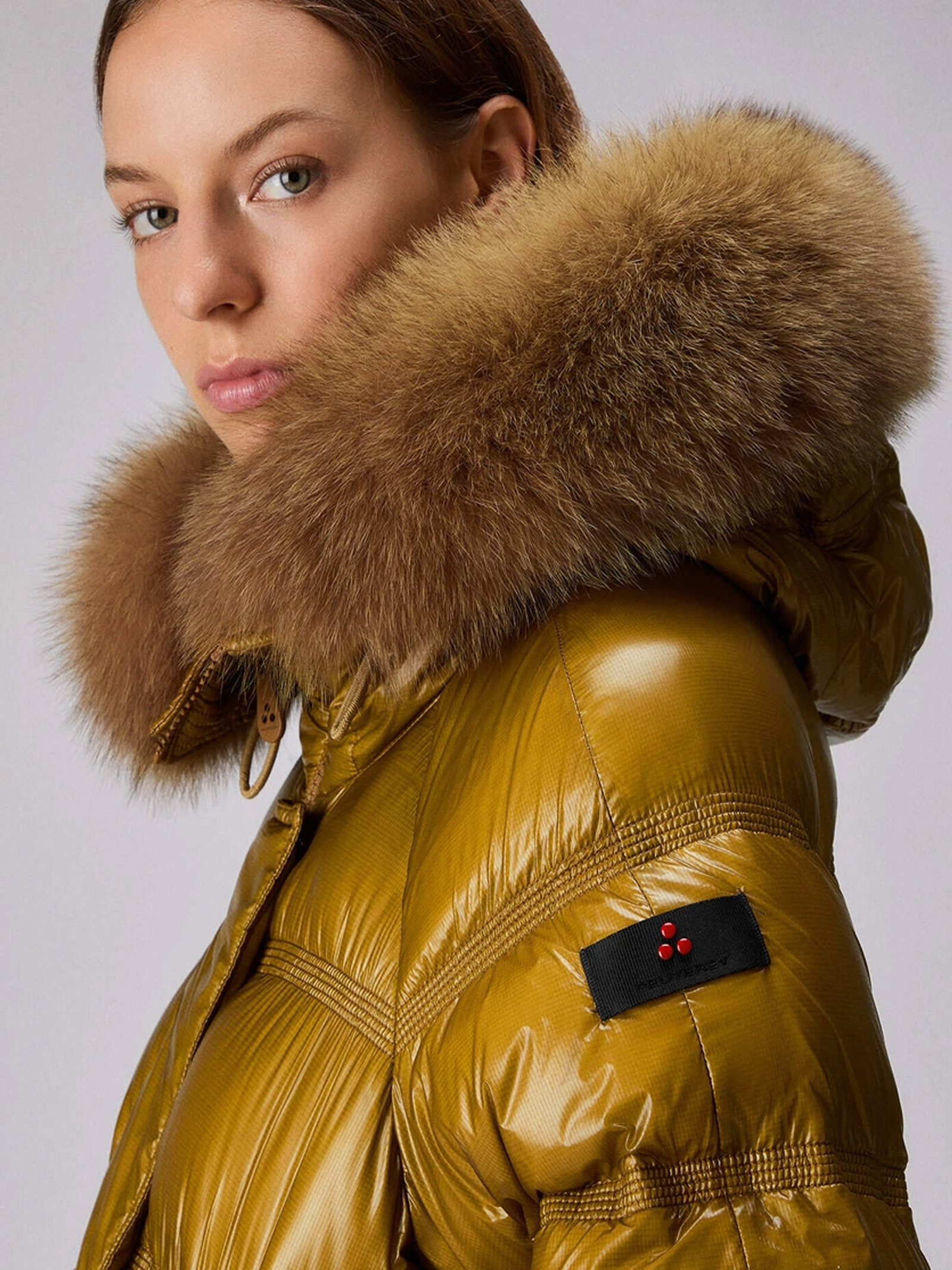Piumino in nylon ripstop 7den dallaspetto lucido. La ricchezza dei dettagli fa di questo capo un pezzo immancabile del guardaroba femminile della stagione invernale. Collo ampio, cappuccio a cratere con bordo di pelliccia di volpe staccabile, full zip centrale con doppio cursore coperta da paramontura, tasche laterali a filetto, due aperture con zip laterali ai fianchi e soffice imbottitura in piuma doca certificata. Un caldo abbraccio che protegge dal freddo e dalle intemperie. Idrorepellente e downproof.