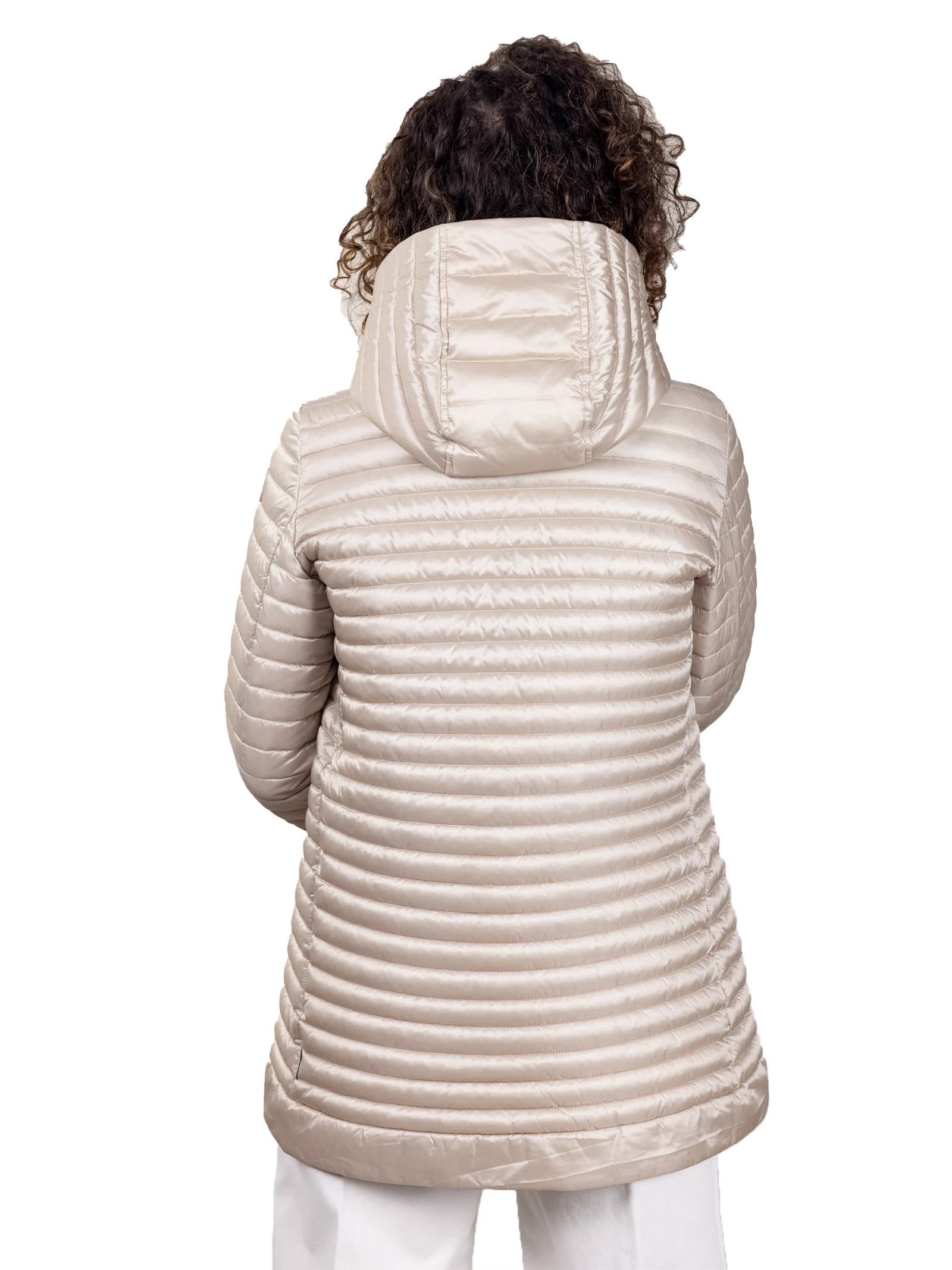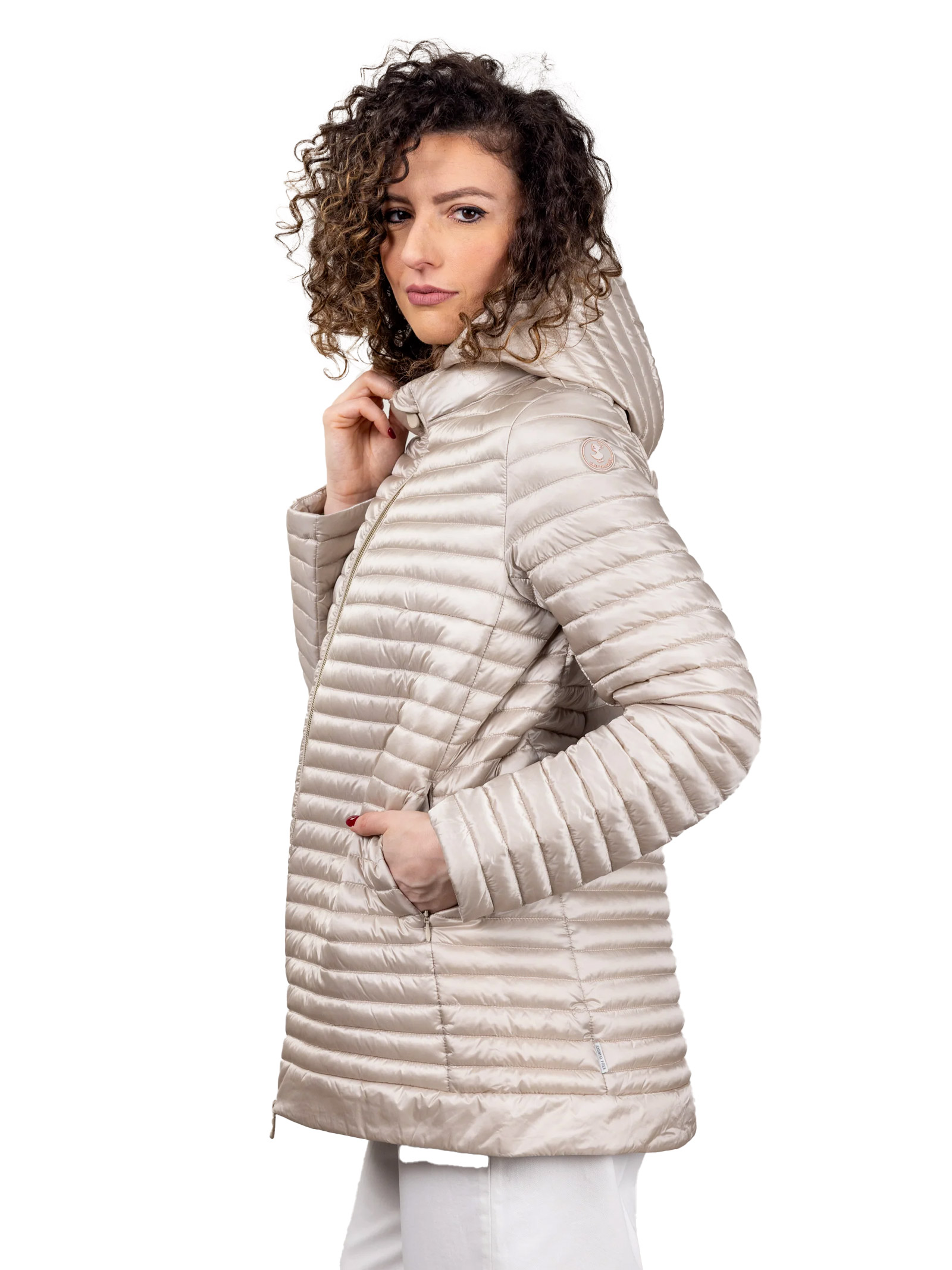 Tanto caldo quanto leggero, il piumino animal free donna modello Alima si distingue per il taglio ad A, rifinito da una banda liscia sul fondo. Dotato di cappuccio rimovibile e tasche basse, si distingue per i tirazip personalizzati della cerniera centrale e il logo in gomma tono su tono applicato sulla manica sinistra.
