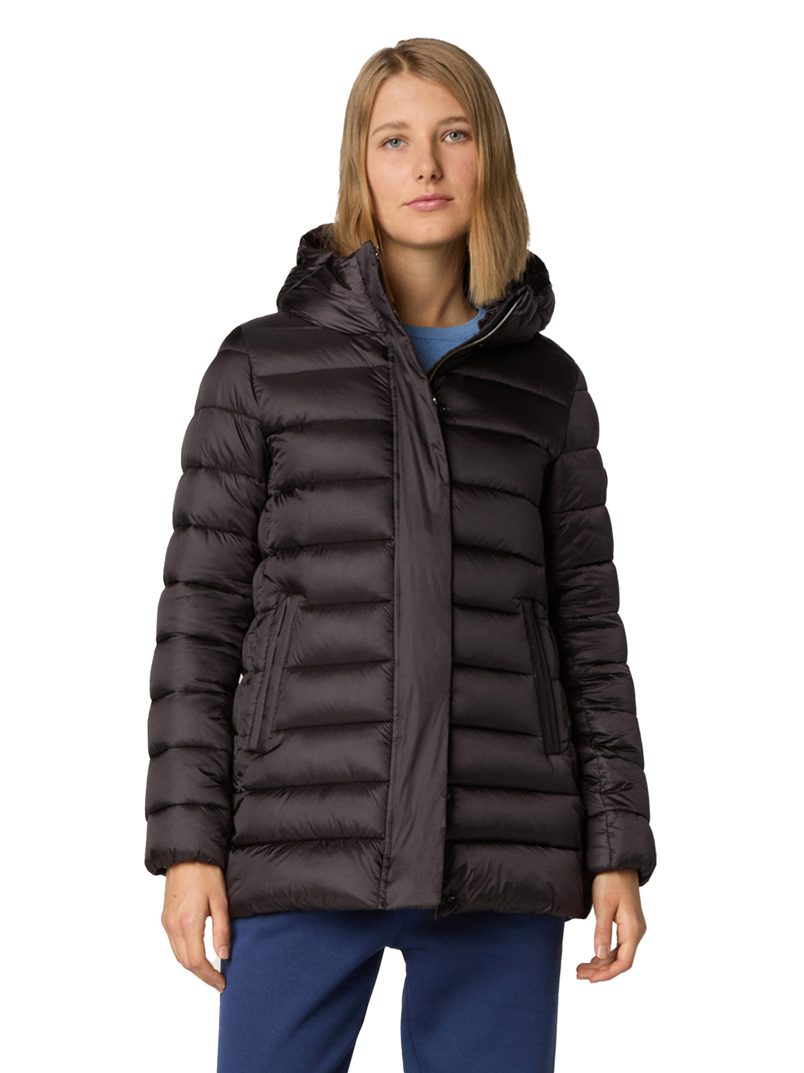 Garanzia di stile e comfort contro il freddo Drimia è una versatile puffer jacket dalla linea lunga e morbida con un comodo cappuccio. Chiusa da zip brillante e patta con bottoni si presenta con il tiretto personalizzato e piccolo logo rotondo tono su tono sulla manica.
