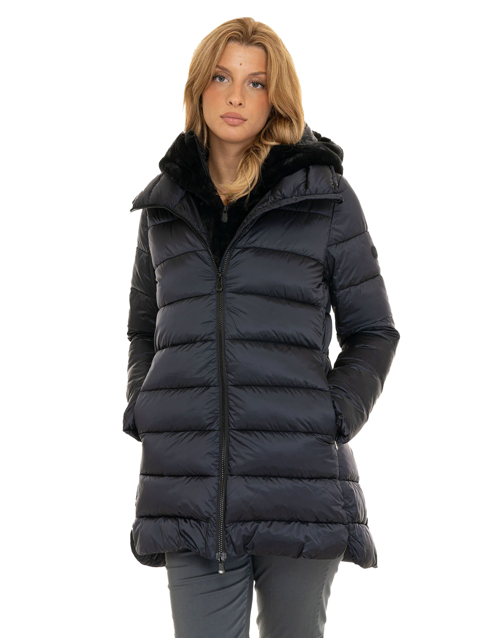 Matilda è un piumino con linea ad A realizzato in nylon riciclato dalla finitura brillante. Il modello trapuntato si distingue per il cappuccio e il davantino rimovibili in pelliccia sintetica tono su tono, che aggiungono un tocco extra di stile e morbidezza. Presenta una zip a doppio cursore con tirazip personalizzato, tasche nascoste con zip e logo tondo sulla manica.