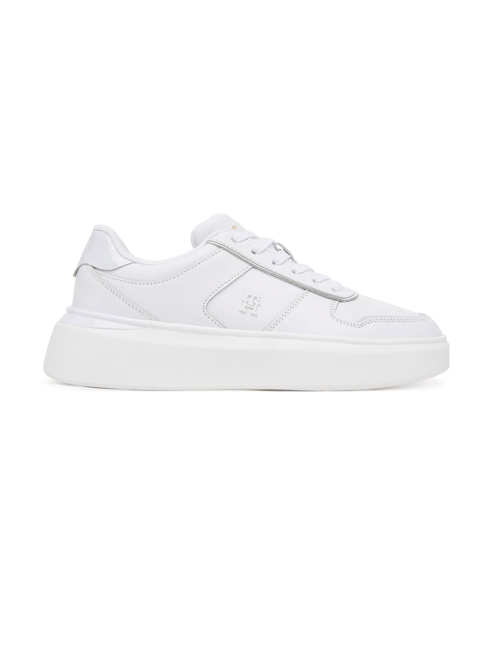 Le sneakers in pelle dal design elegante, con finitura verniciata e suola alta, sono un autentico esempio di stile contemporaneo.