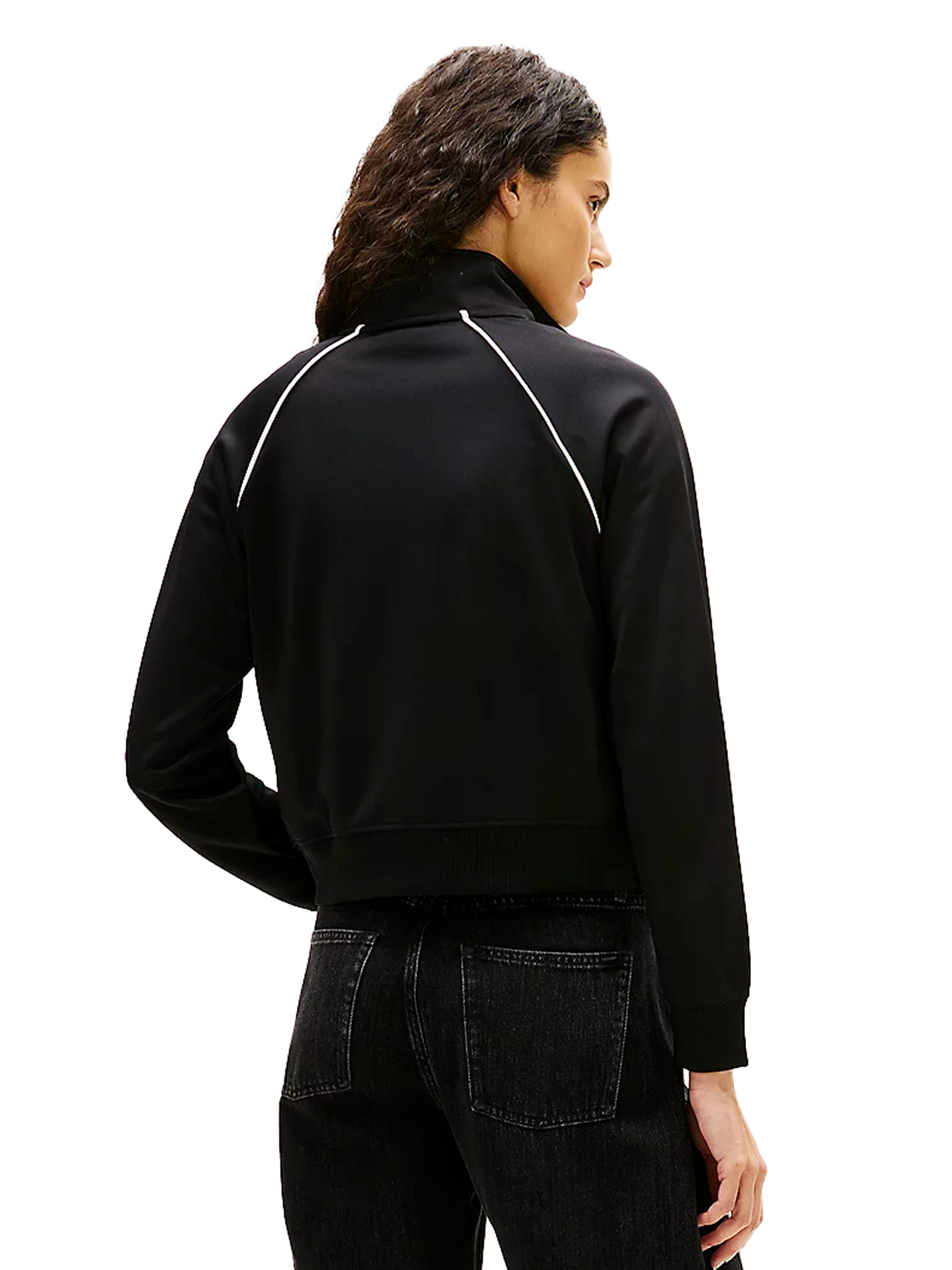 La giacca sportiva in tessuto tecnico stretch a maglia interlock, con zip e collo a imbuto, si distingue per i profili a contrasto in stile rétro.